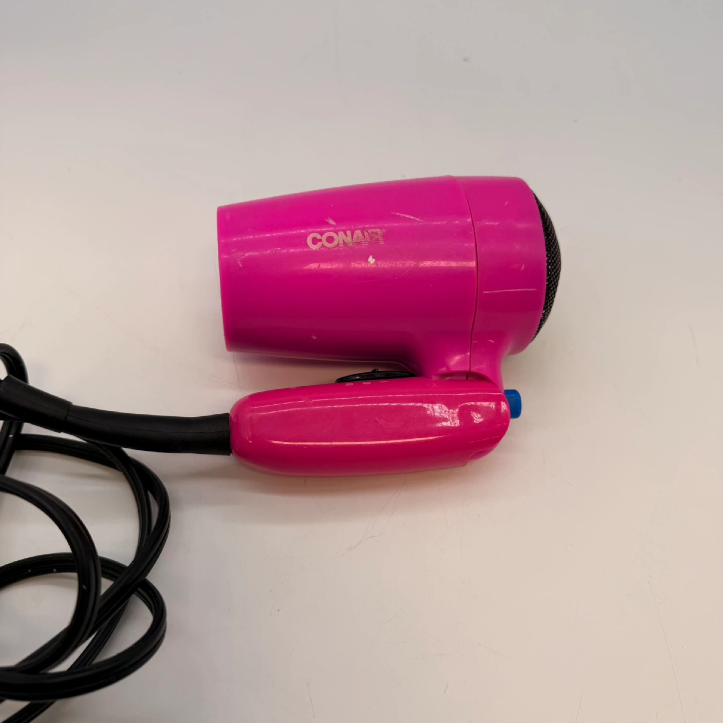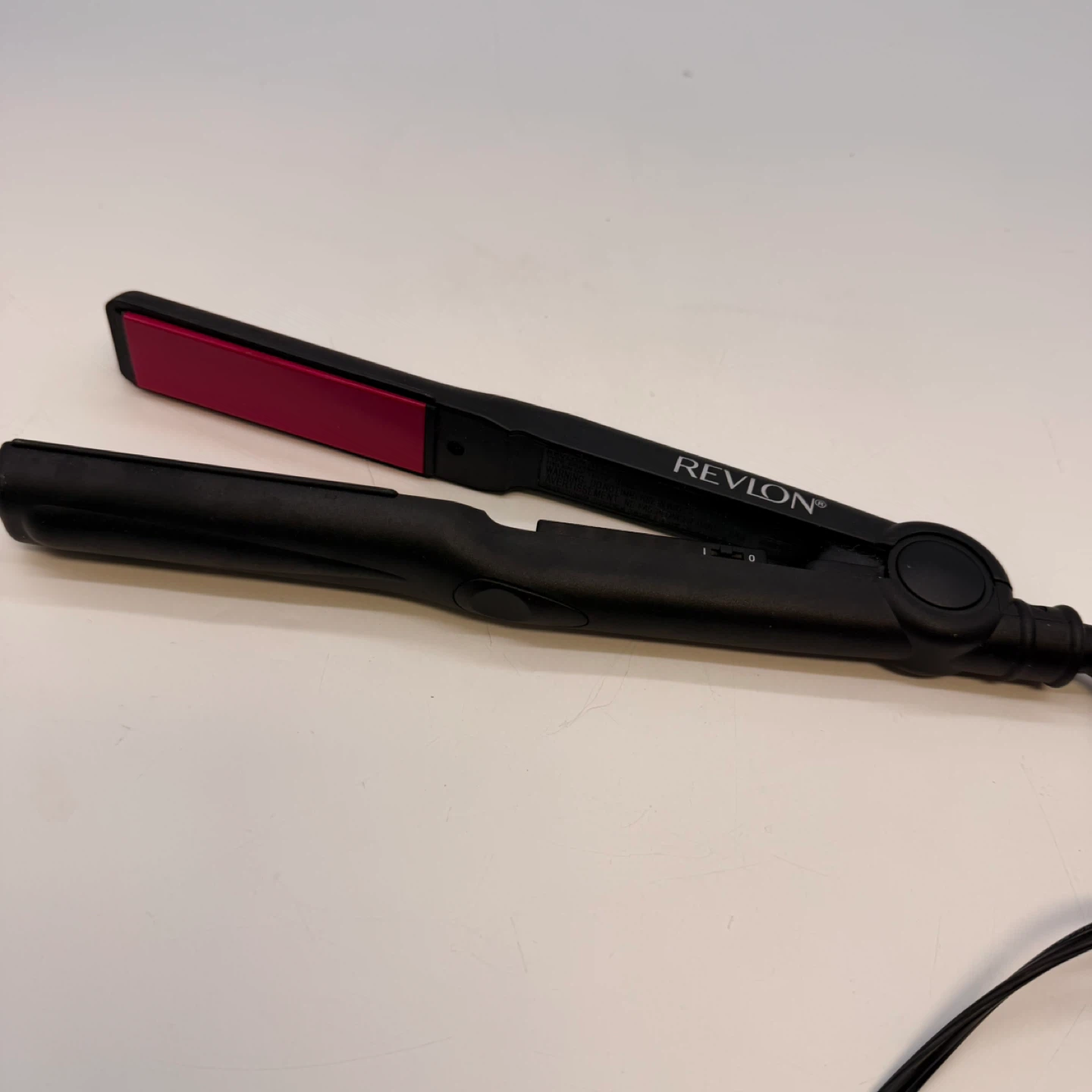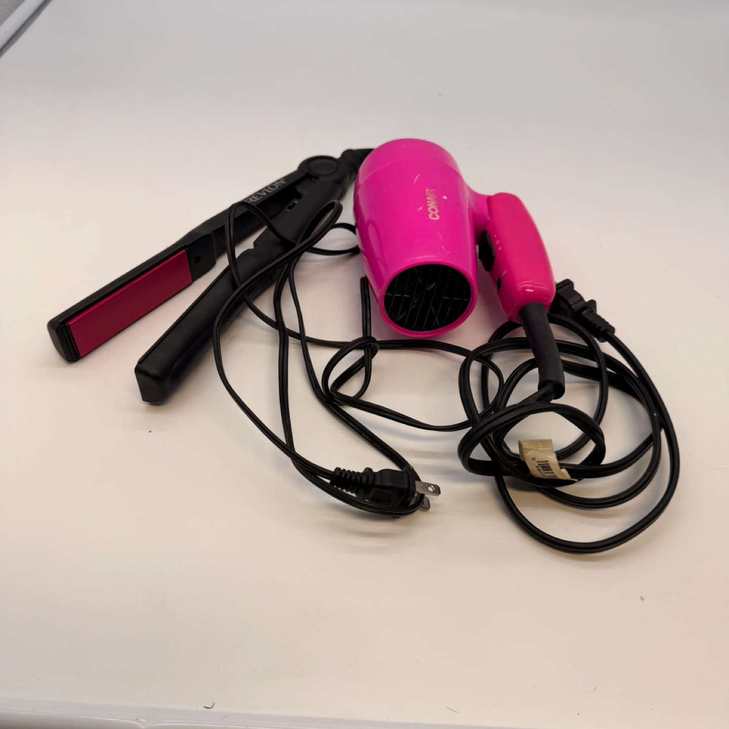 This listing includes a black Revlon flat iron with pink plates and a bright pink Conair mini hair dryer. Both items are in good condition and ready for use.