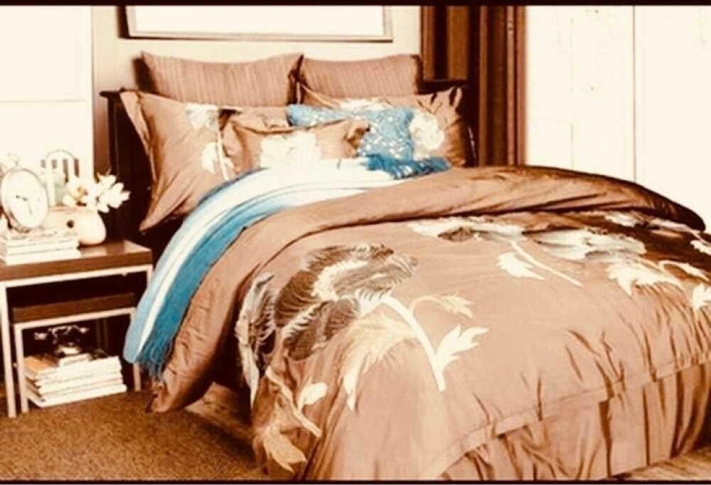 Brand new beautiful King size duvet cover and two pillow shams, featuring a chocolate brown background with a large, detailed floral design in blue and green. It's made from a silky, smooth material. It's a lovely way to add a touch of elegance to your bedroom!