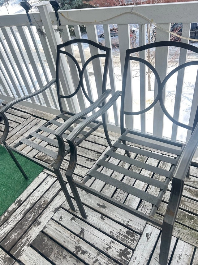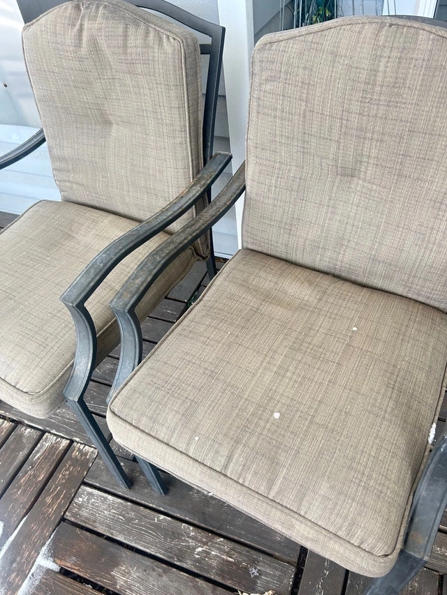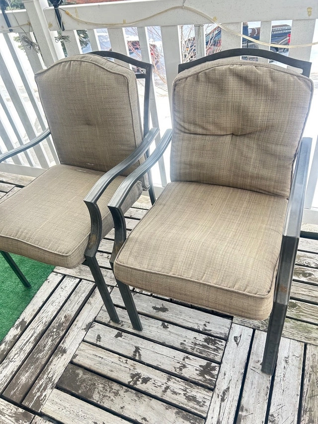 4 metal patio chairs, with cushions. Cushions are one piece, and velcro on at top. Very comfortable, 2 chairs like new, 2 need cleaning. All cushions in very good condition. Pickup in Kanata, near Moodie Dr & Queensway. No delivery.