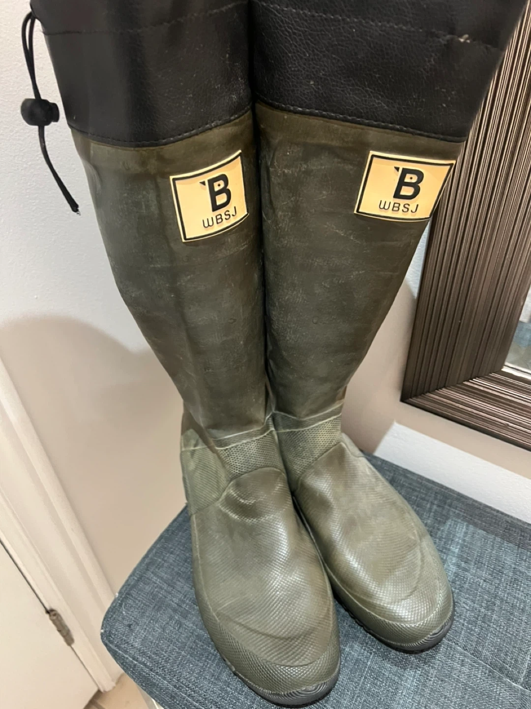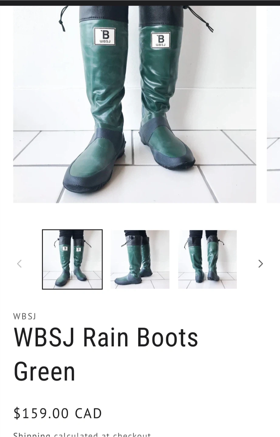Selling a pair of WBSJ rain boots in green. They're in great shape and ready for rainy days! Originally bought for $159 CAD. One tie is missing on the left boot .