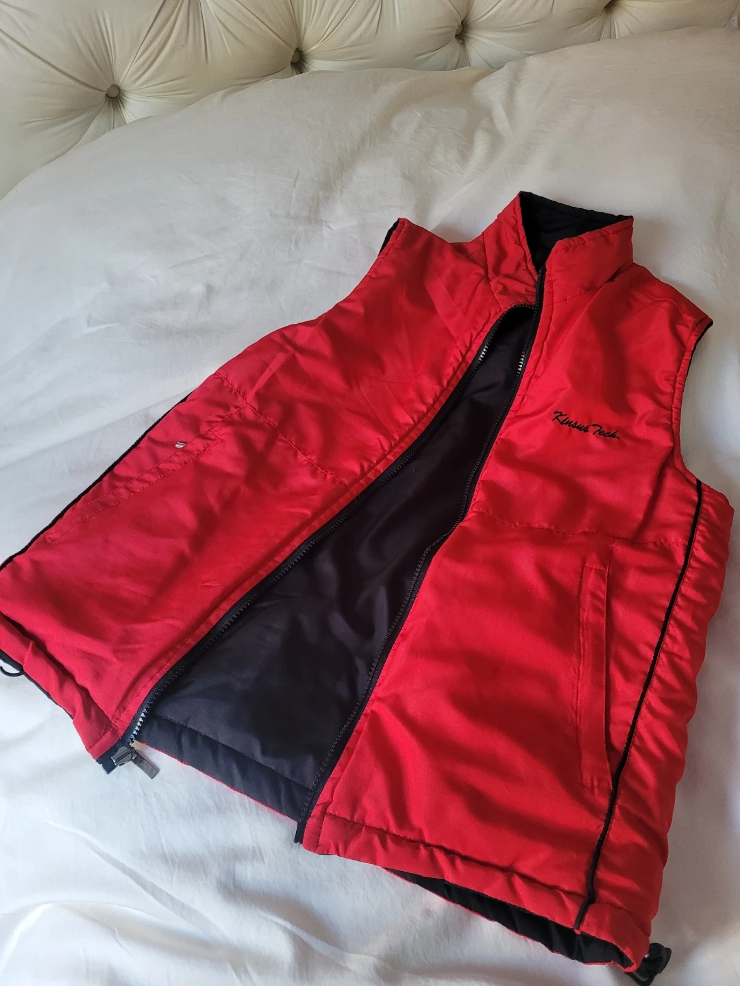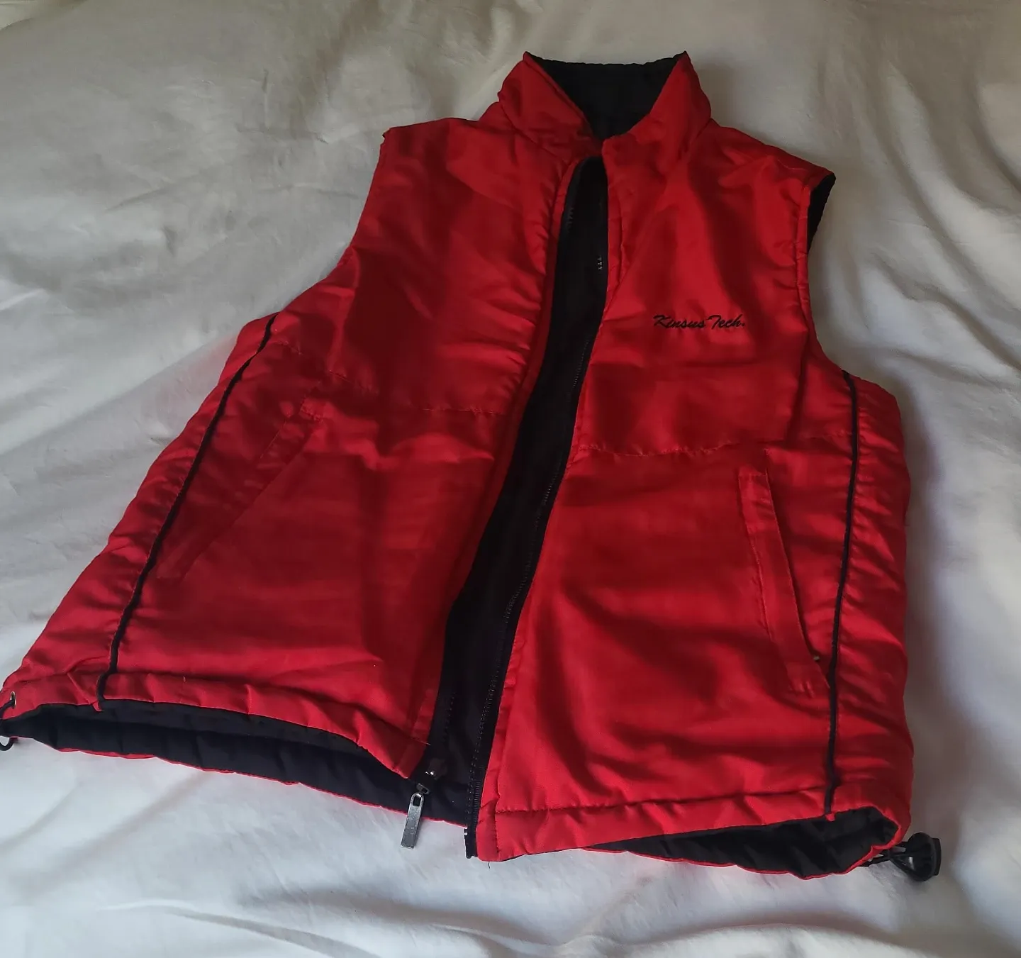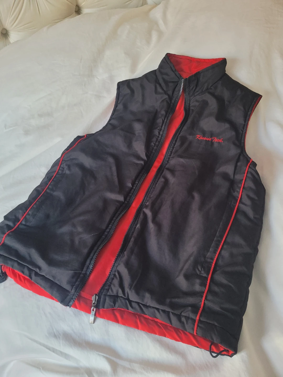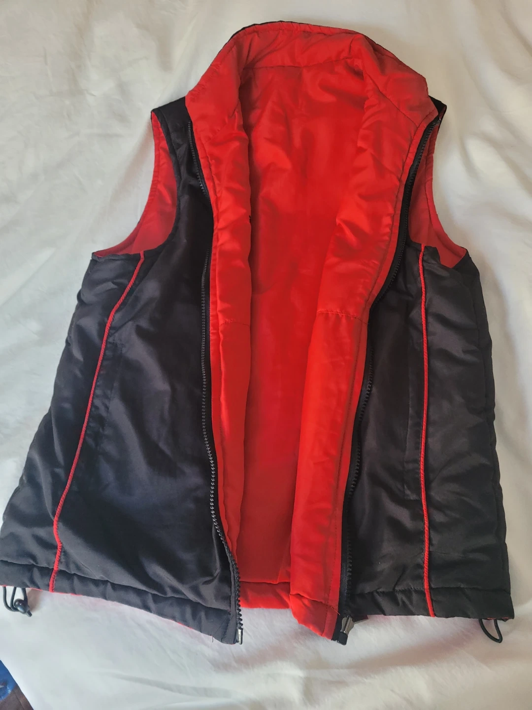 Reversible vest, red on one side and black on the other. It's got a full zip closure and two side pockets. Material appears to be nylon. Small fraying at seam in 2 places.