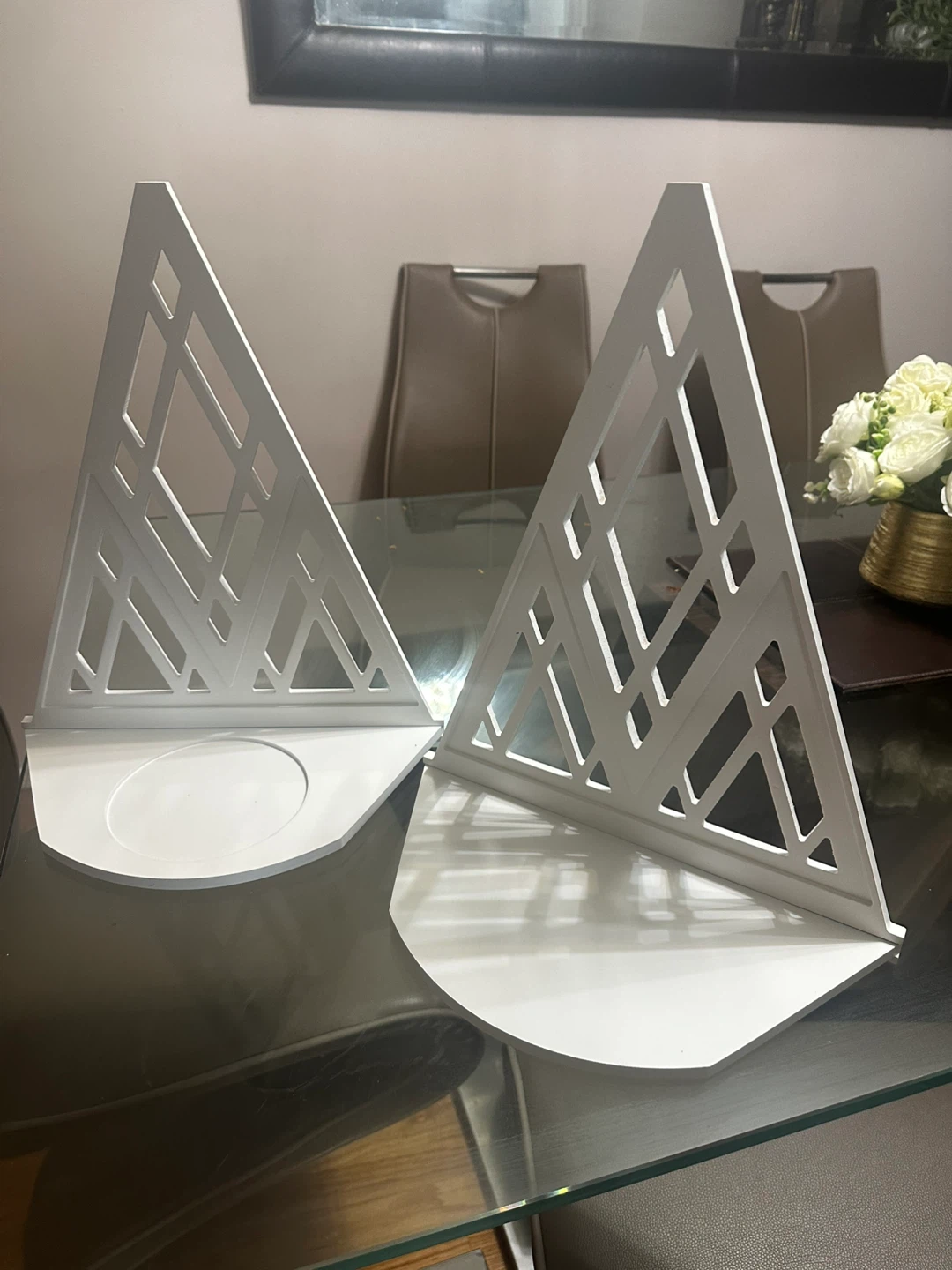 Selling a set of two white triangle wall shelf bookends! They can be used as shelves or bookends, adding a modern touch to any room. They are in great condition and ready for a new home