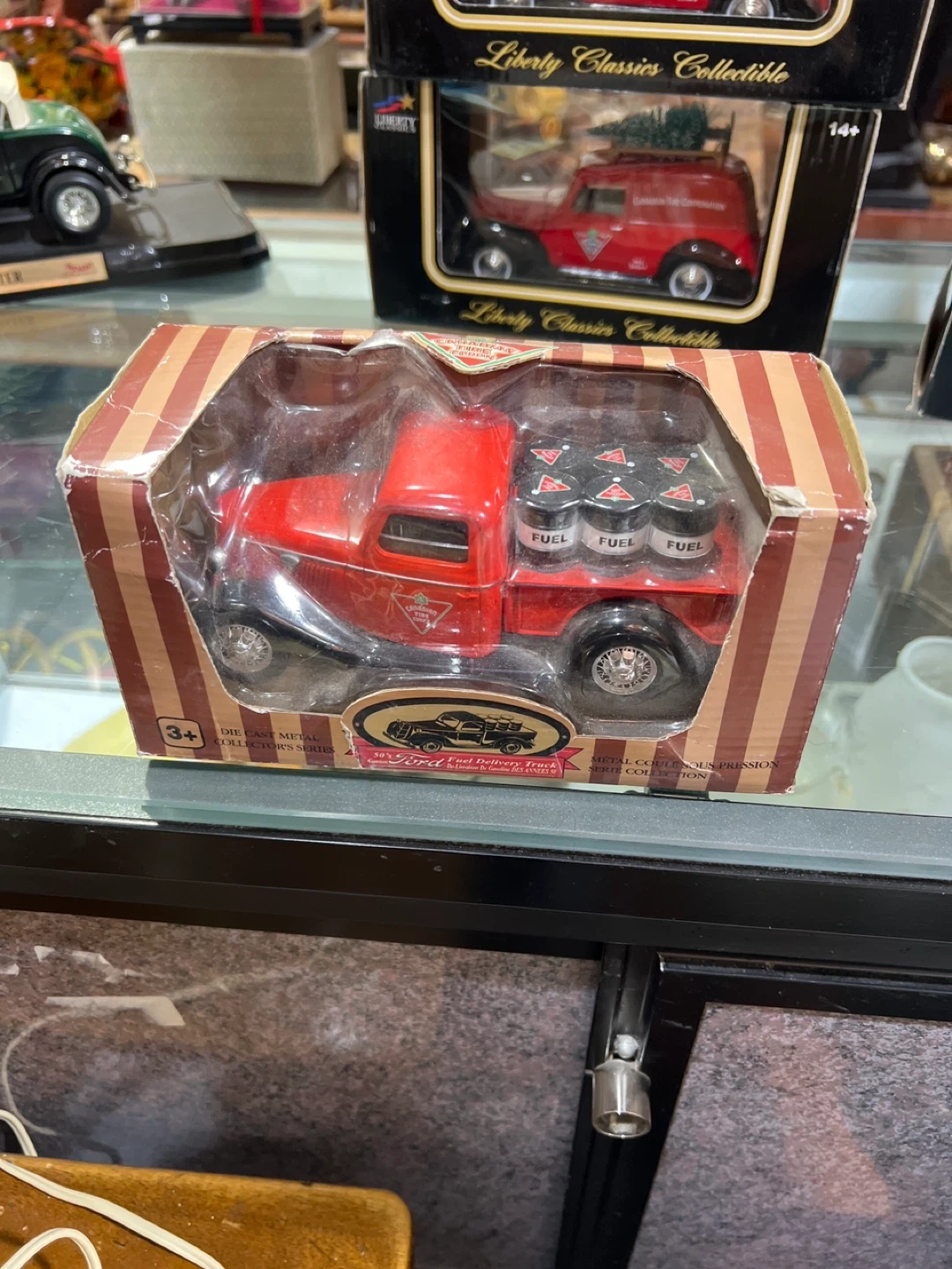 This is a Liberty Classics die-cast metal collectible truck. It's a Ford fuel delivery truck with miniature fuel barrels in the back. Includes original packaging.