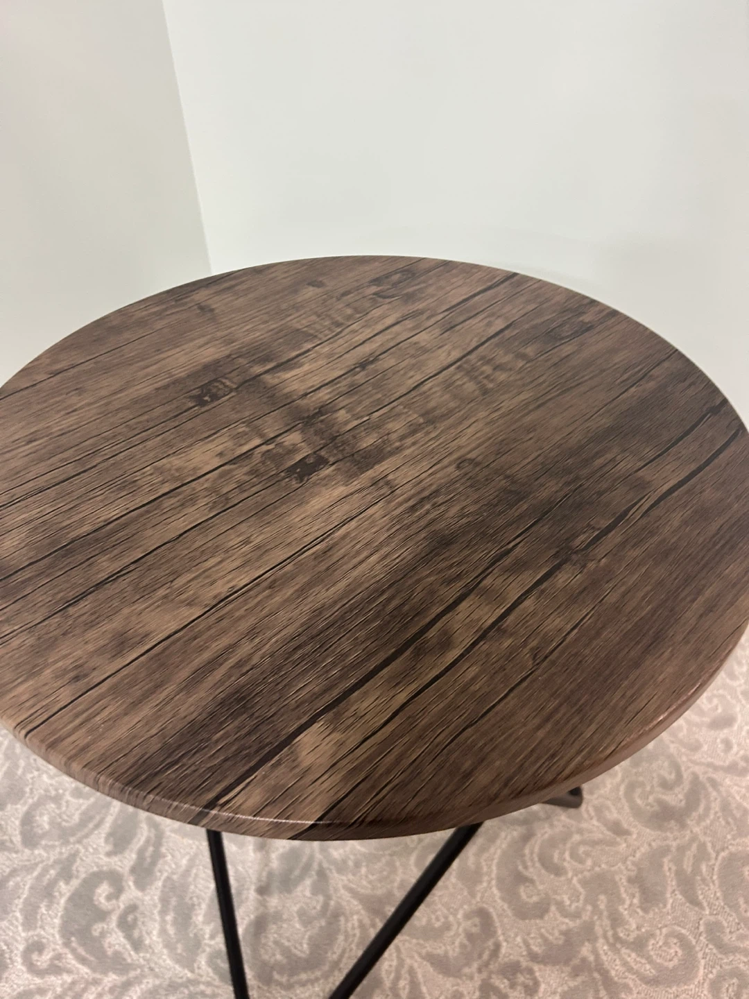 Price is negotiable. This handy side table features a wood-look top and a collapsible black metal base. It's easy to set up and take down. This table is useful for placing drinks, snacks, or small decorative items. Measures approximately 18 inches in height.