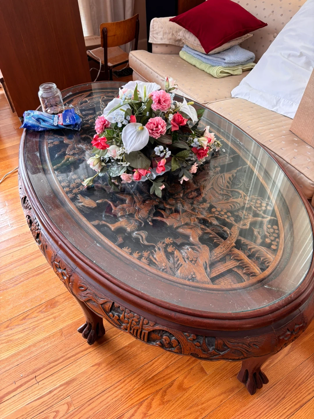Vintage Oval Coffee Table with Glass Top and Carved Wood Base