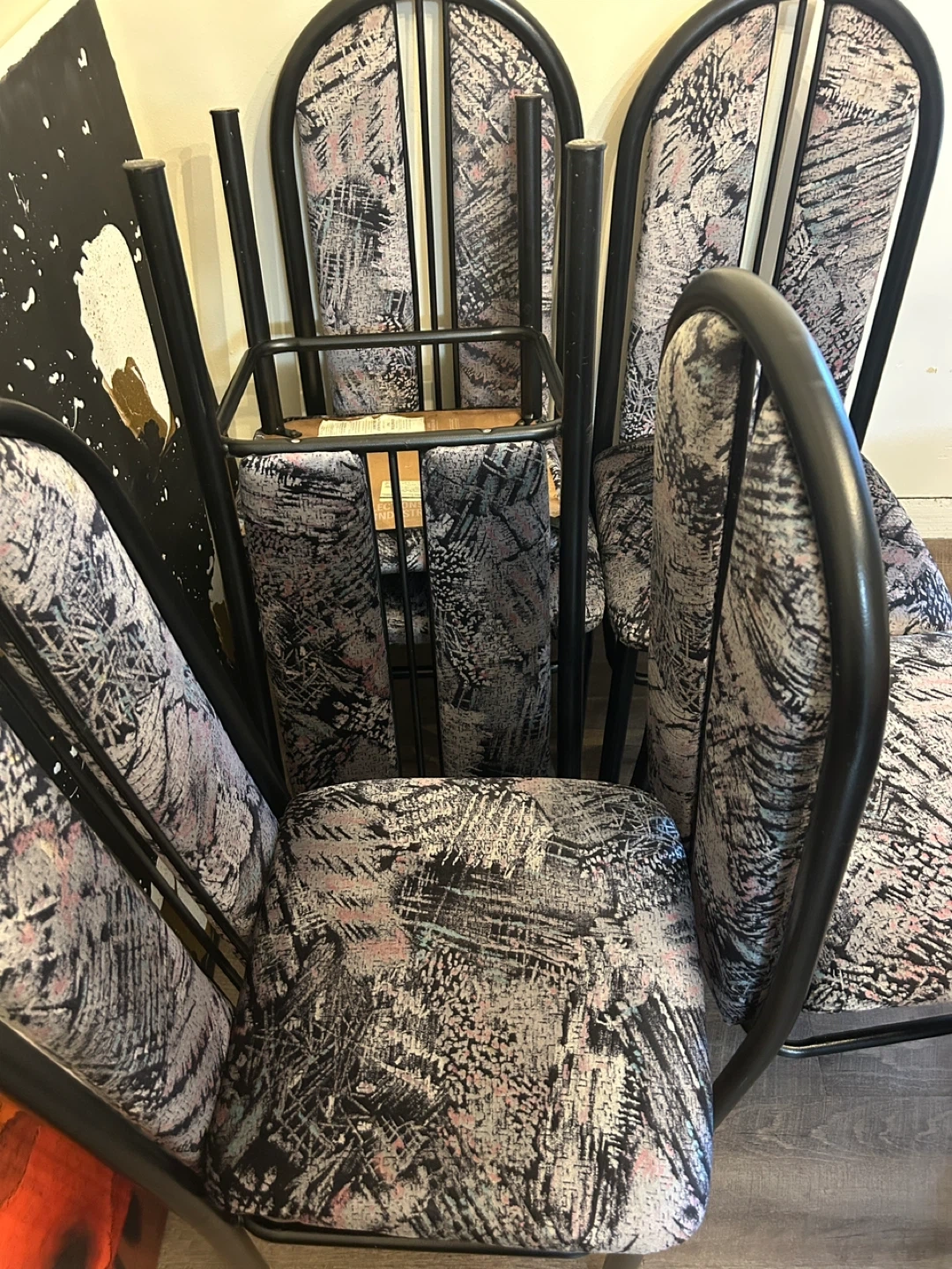 A set of four dining chairs with black metal frames and upholstered seats featuring a retro abstract pattern. Upholstery is a mix of grey, pink, and black. Metal frame construction.