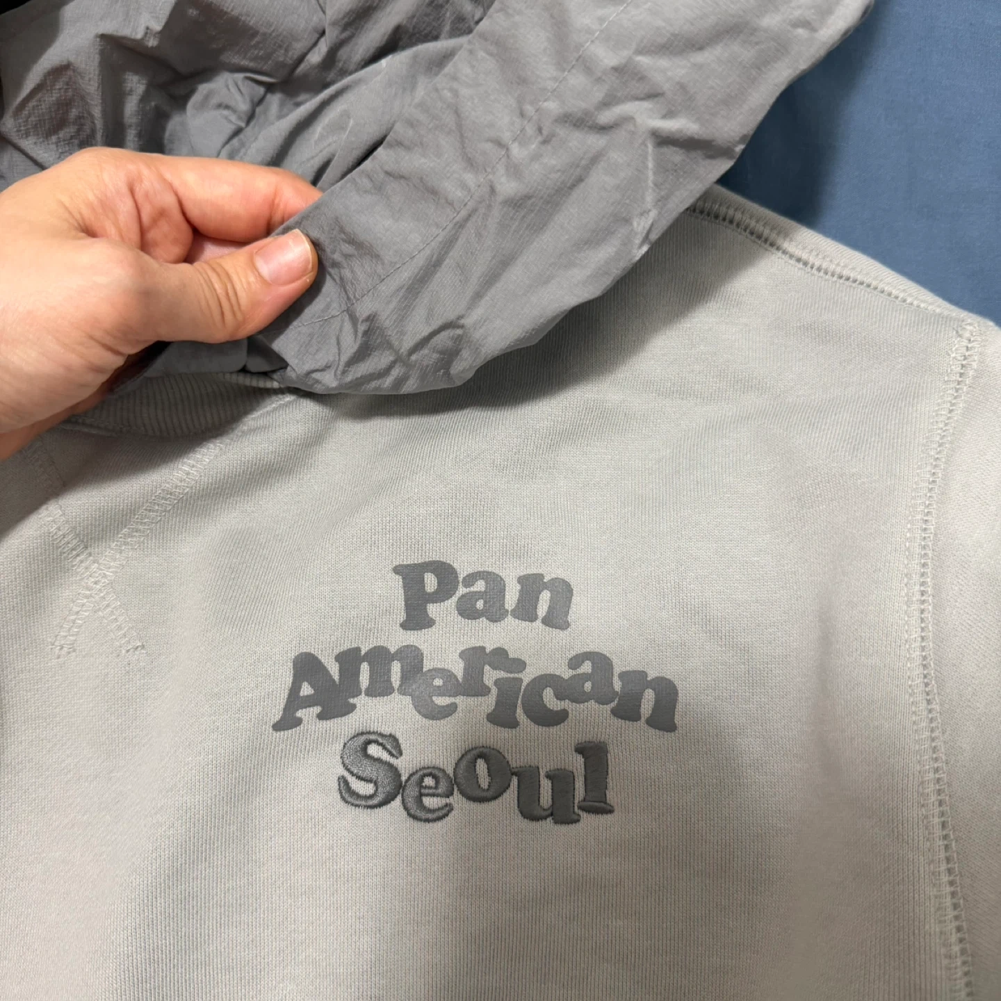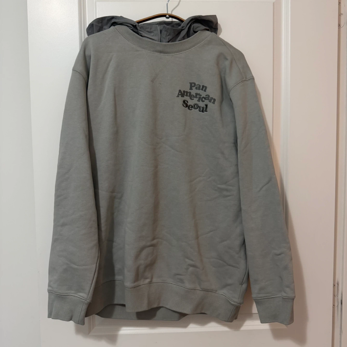 Comfortable grey/khaki sweatshirt with a “Pan American Seoul” graphic on the front.