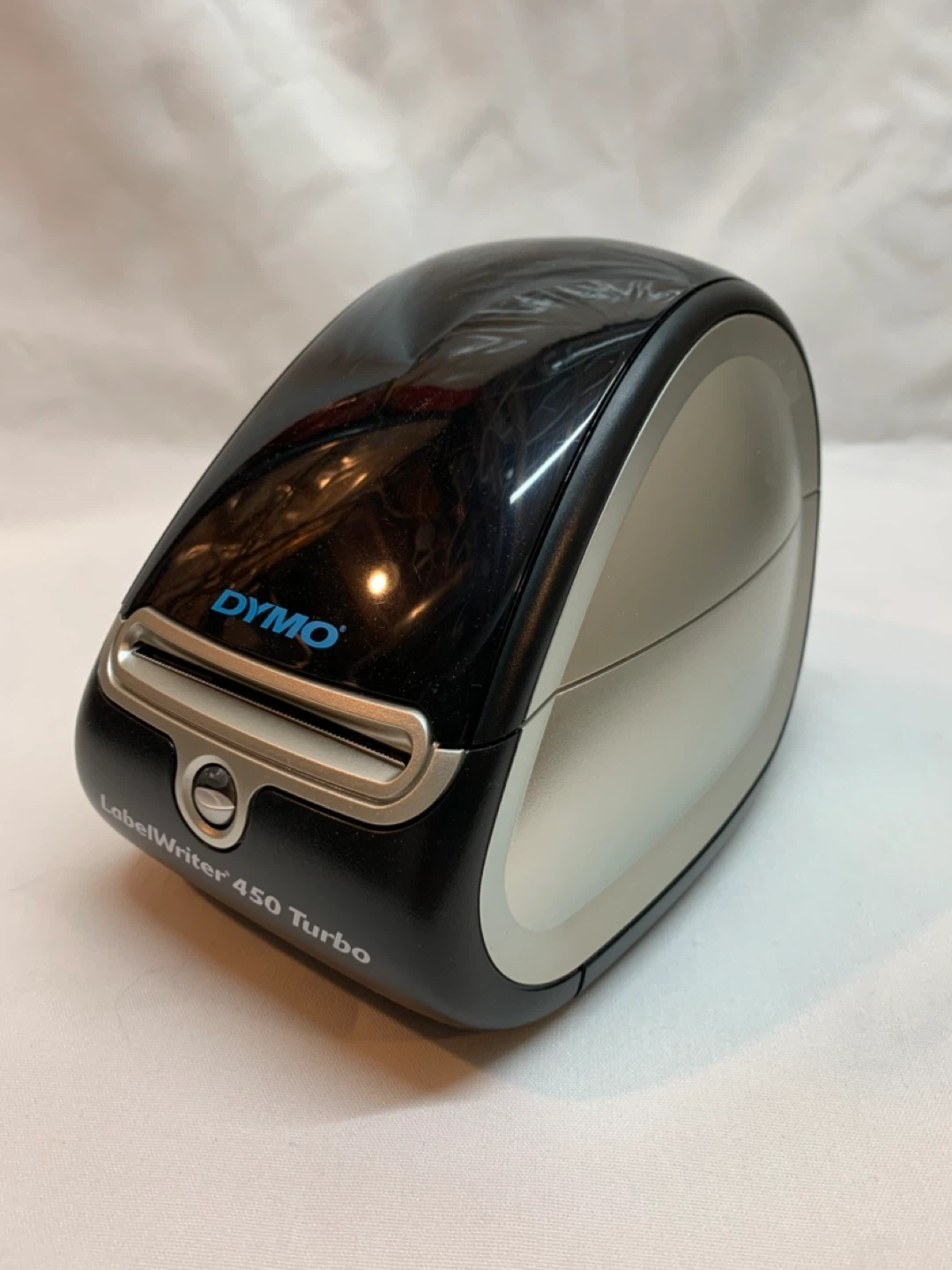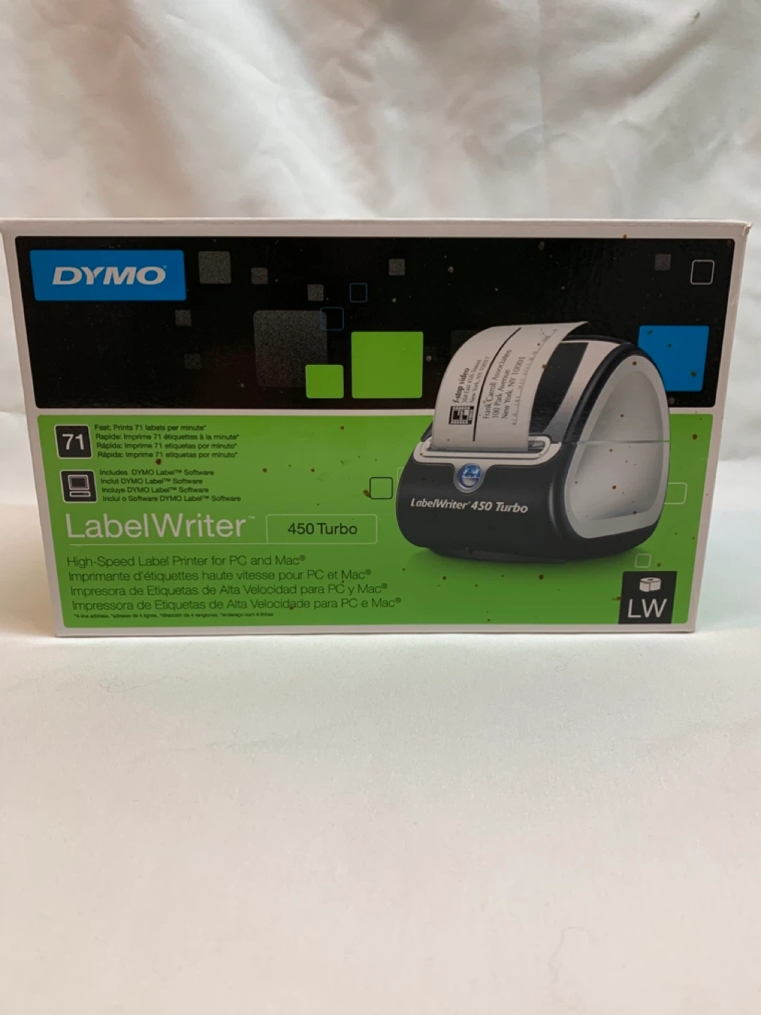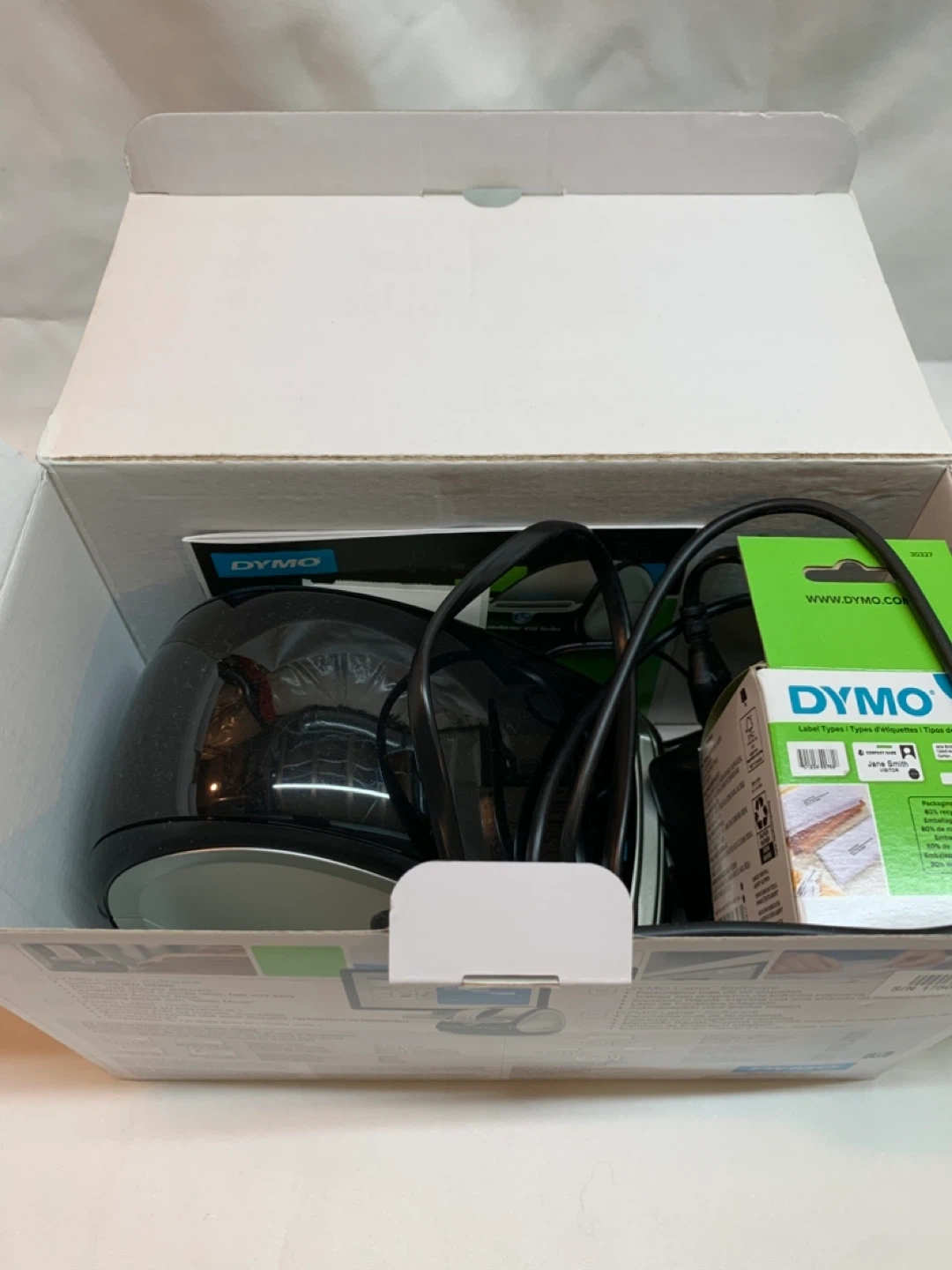 High-speed label printer for PC and Mac. Prints up to 71 labels per minute. Includes Dymo Label Software. Black and silver design. Brand new in package.