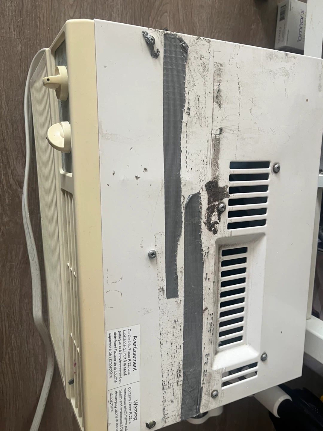 Forest Air window air conditioner with multiple settings. Unit has a white exterior and comes with a power cord. Some tape residue is visible on the back.