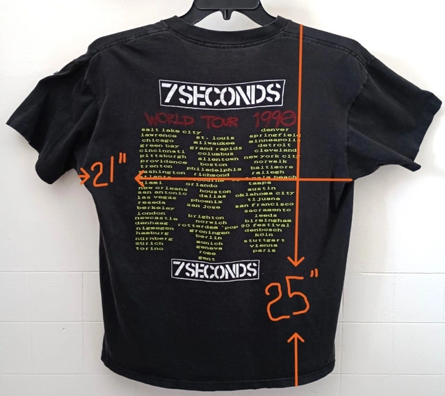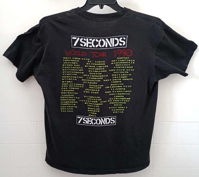 Hard-to-find vintage 1990 7 Seconds world tour shirt with front and back print in great used shape with minimal fading. The front print has some ink cracking, but no holes or rips. It's a size large (measurements shown in photo) and the tag reads: Funstuff N.Y. Made in U.S.A. Available for a safe, public meet-up in downtown Kitchener.