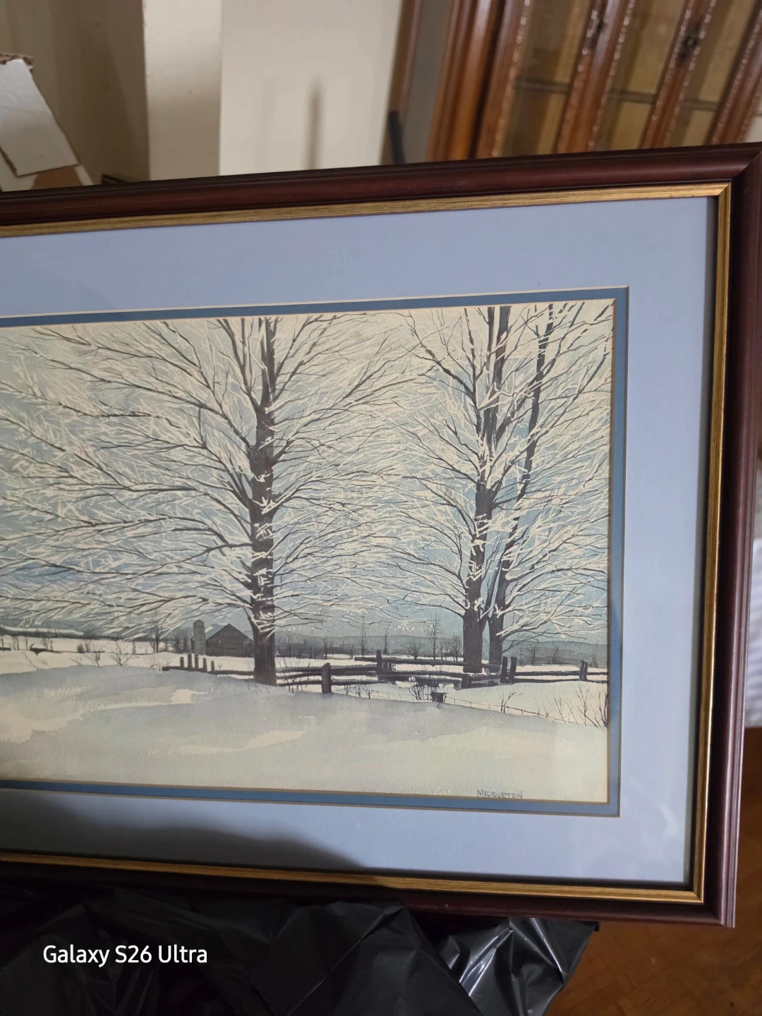 Framed watercolor painting depicting a serene winter landscape with snow-covered trees and a barn. The artwork is signed 'Middleton' and is beautifully matted. It's a lovely piece for adding a touch of rustic charm to any room.