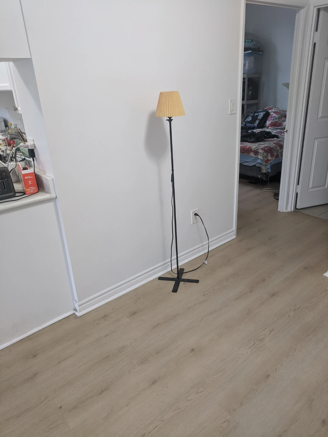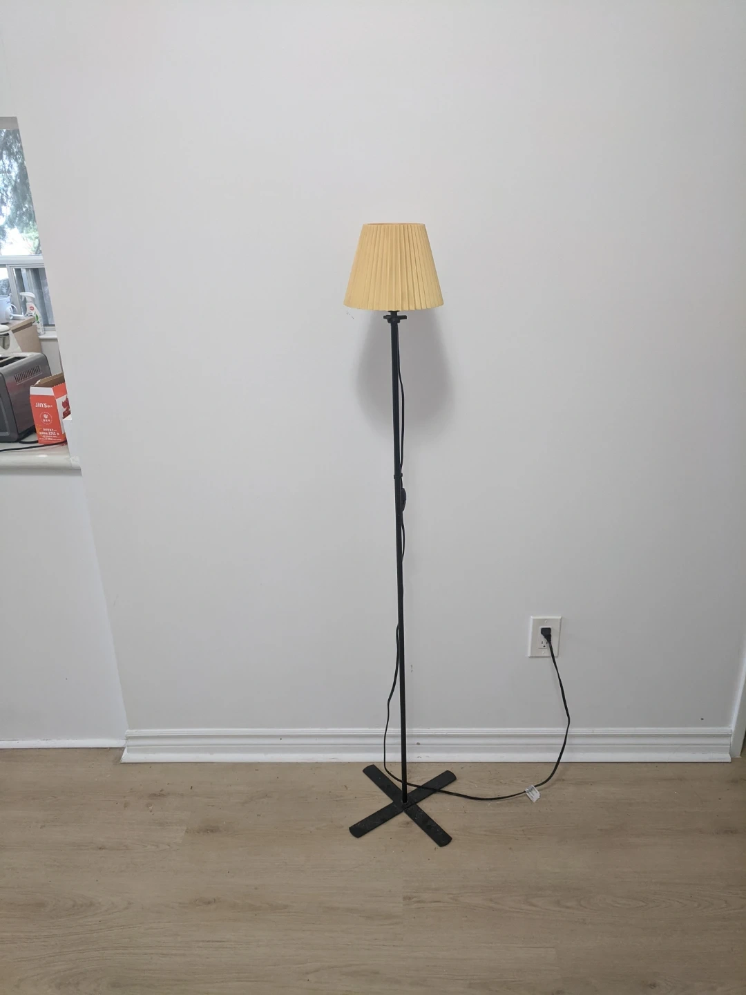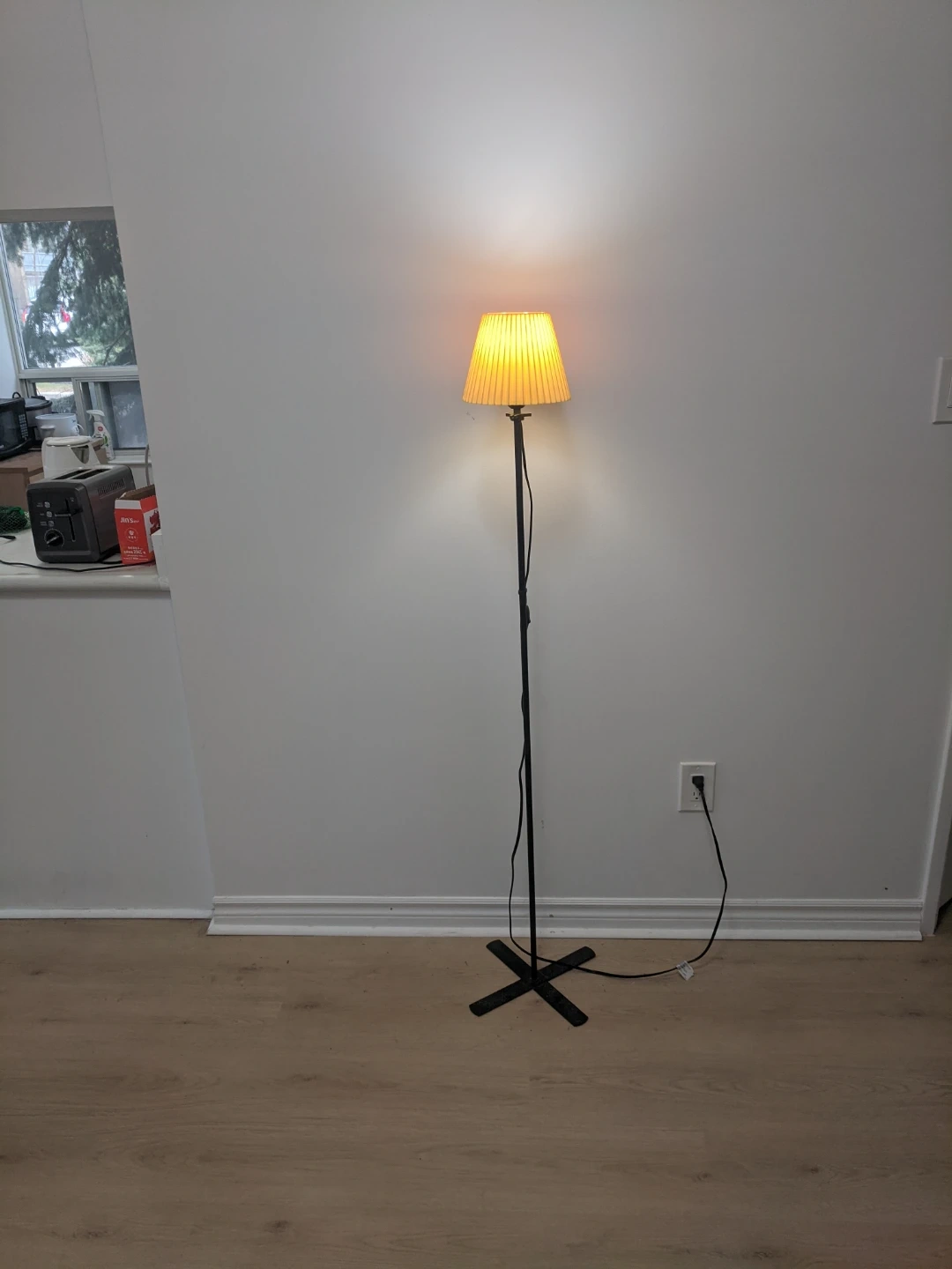 Black metal floor lamp with a pleated yellow fabric shade. It has an inline on/off switch on the power cord. The base is a simple cross design. Pick up at 195 Merton Street Toronto or pick up at subway station Davisvill. And I can deliver it to your house but you need to pay me another $3. Thanks.
