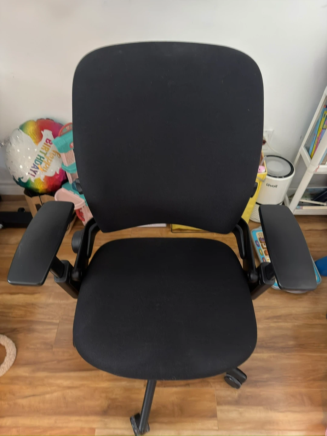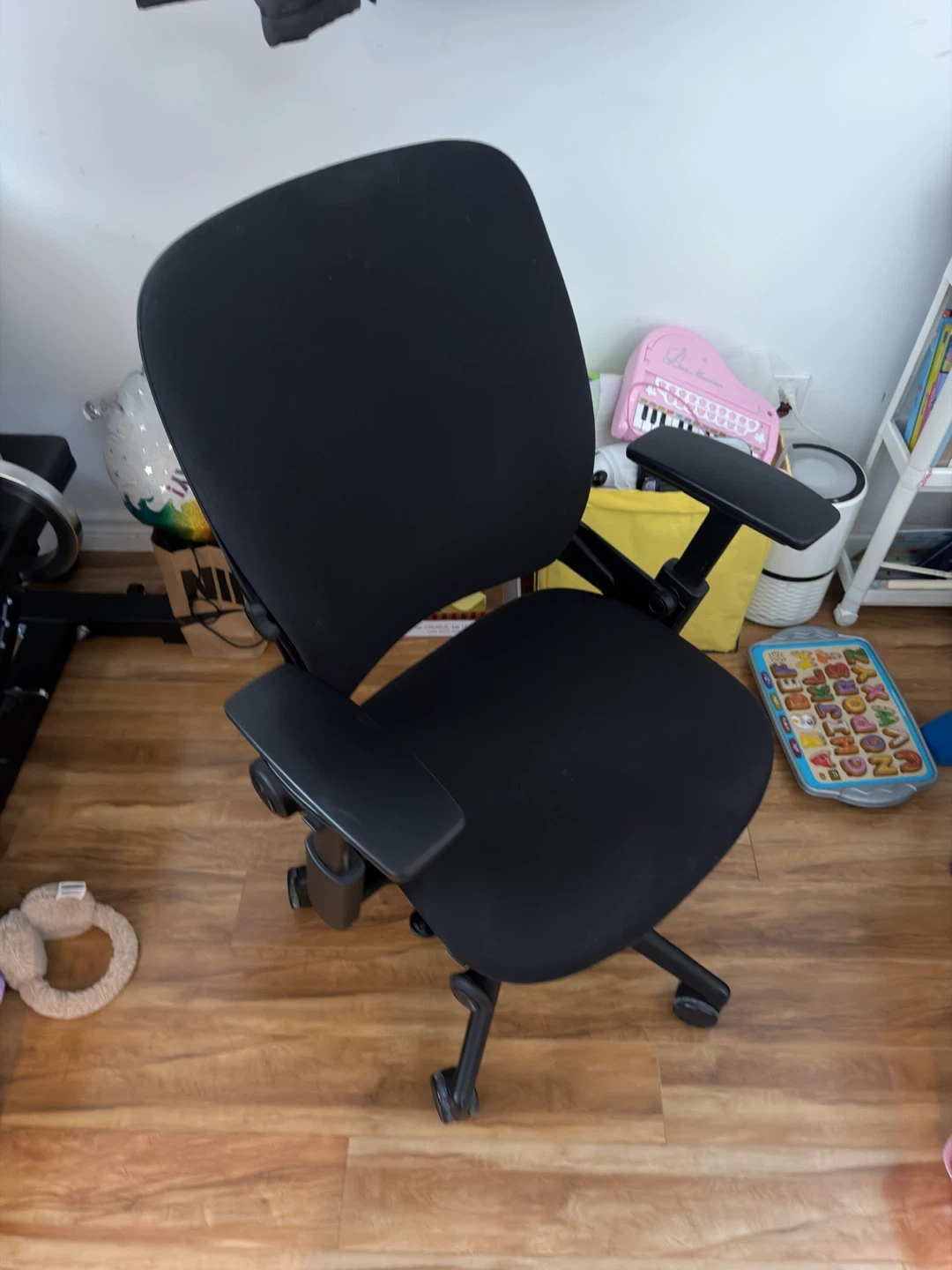 This is a black Steelcase Leap office chair. It features adjustable armrests and lumbar support for comfort. Its ergonomic design makes it suitable for long hours at a desk. The chair is on wheels for easy mobility.