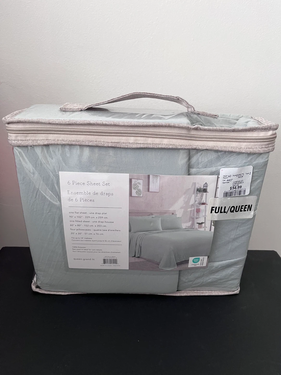 This is a 6-piece sheet set from Canopy Home Elements in a light green/blue colour. It includes one flat sheet, one fitted sheet, and four pillowcases. Made from 100% polyester, it fits up to a 14-inch mattress. Never used