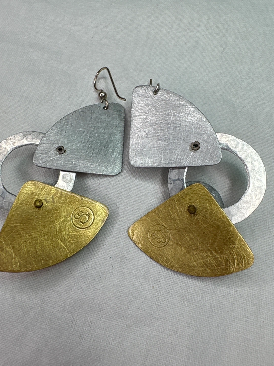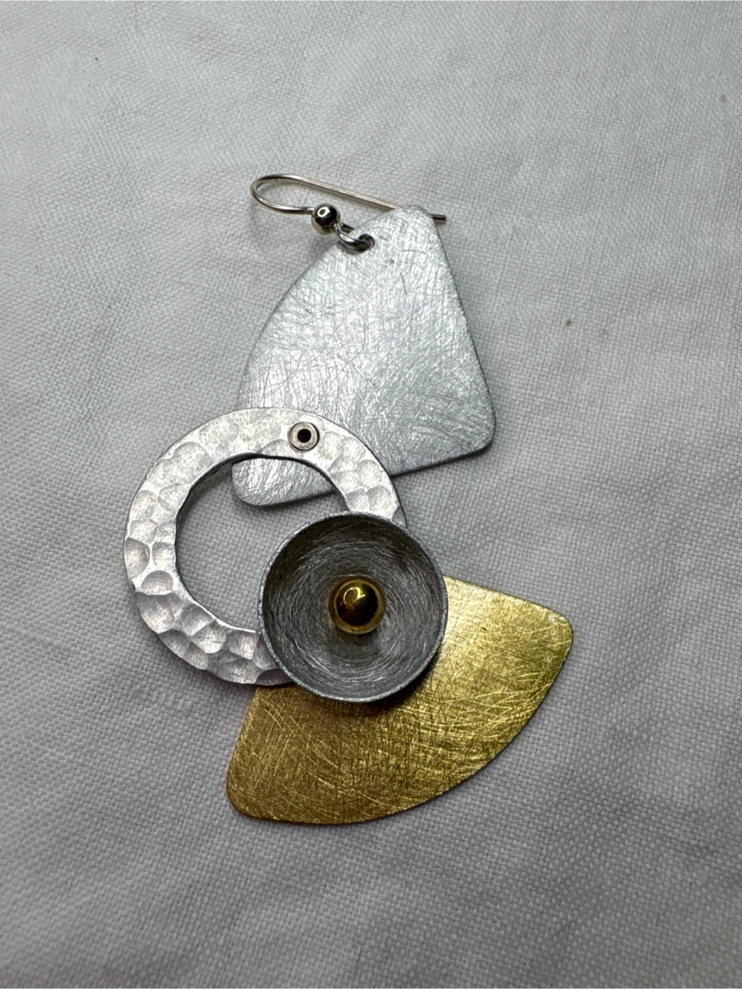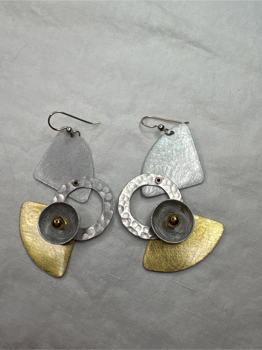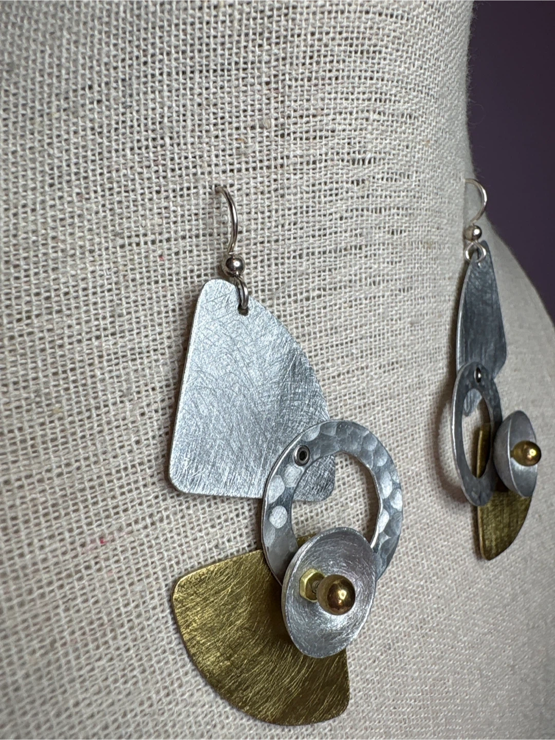 These unique artisan earrings , made by Drift Avant Gard, from their Sculpture Collection, feature a mix of brushed silver and gold-toned metals in a geometric dangle design. They have a hammered ring accent with a small brass bead detail. They're lightweight and add a statement to any outfit!