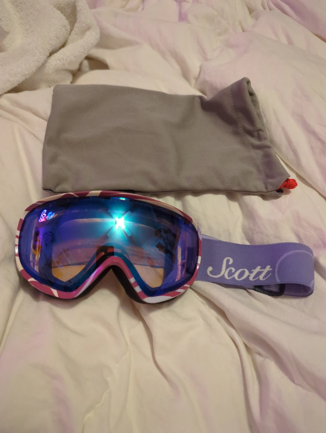 Scott ski goggles featuring a colourful frame and mirrored lenses. It comes with a protective grey pouch for storage. These goggles are suitable for winter sports.