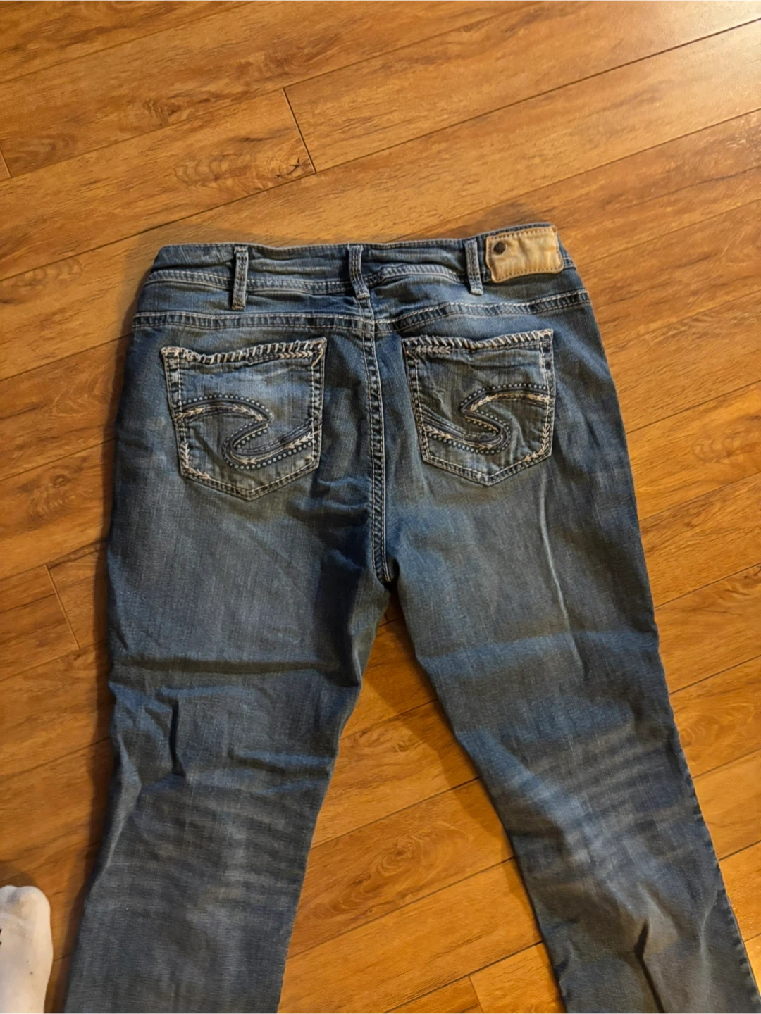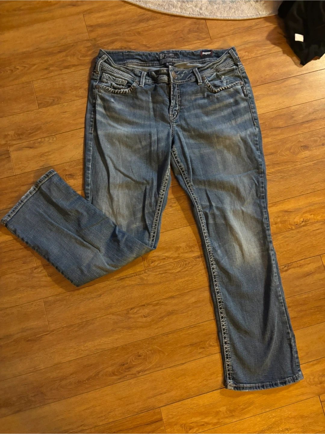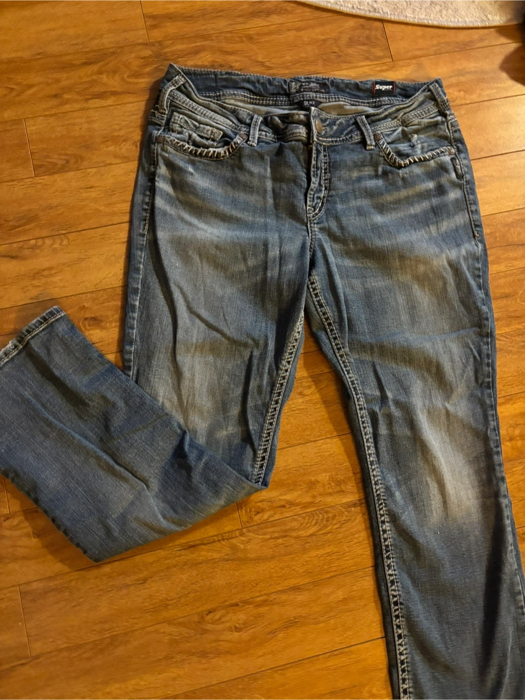 These are Silver Jeans Co. Suki Mid Slim Bootcut jeans. They're a SZ14/L31. Denim material with classic stitching detail.