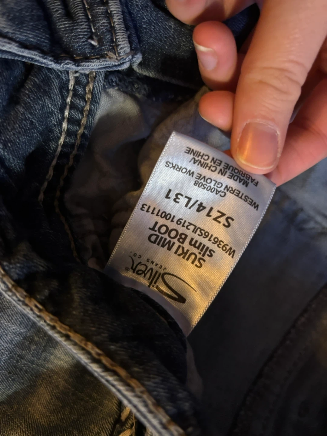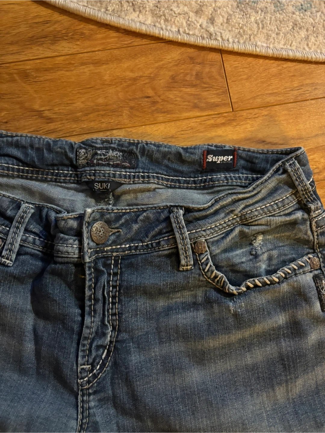 These are Silver Jeans Co. Suki Mid Slim Bootcut jeans. They're a SZ14/L31. Denim material with classic stitching detail.