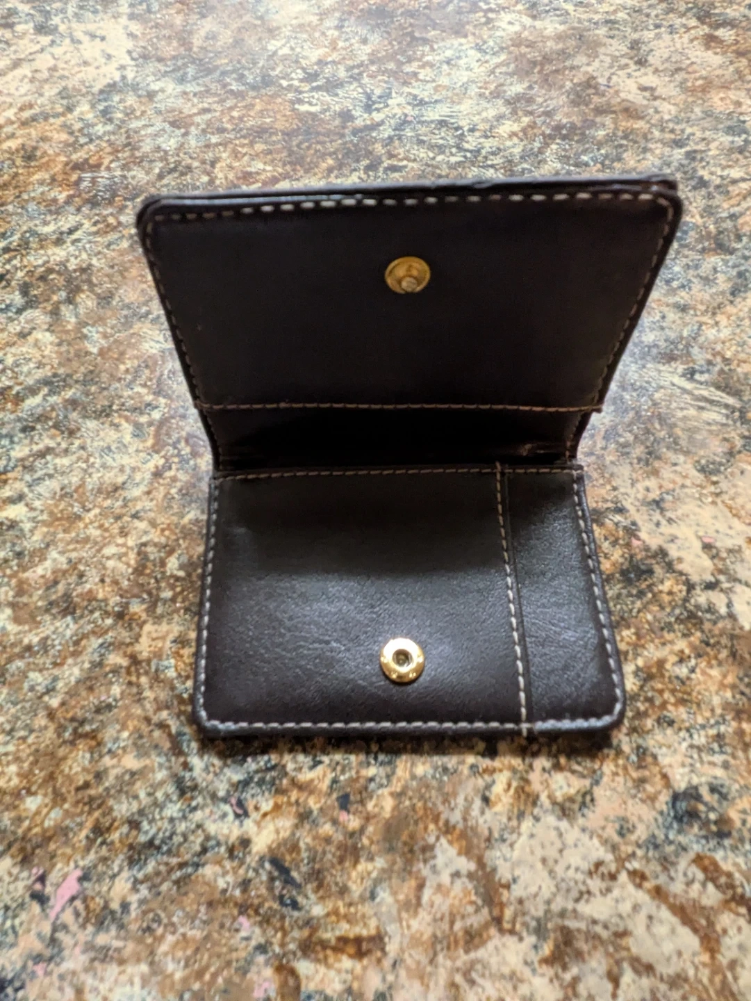 This card holder is made of brown faux leather with a patterned fabric inlay. It features a snap closure. Interior has multiple card slots.