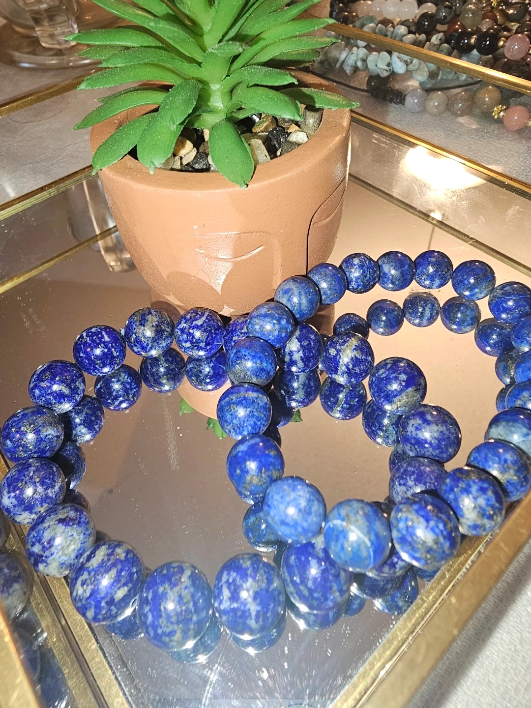 Beautiful lapis lazuli beaded bracelet, perfect for adding a touch of elegance to any outfit! The deep blue colour and unique markings of the lapis lazuli stones make each bracelet one-of-a-kind. Symbolism: Wisdom, truth, power enlightenment, royalty,$25 each
