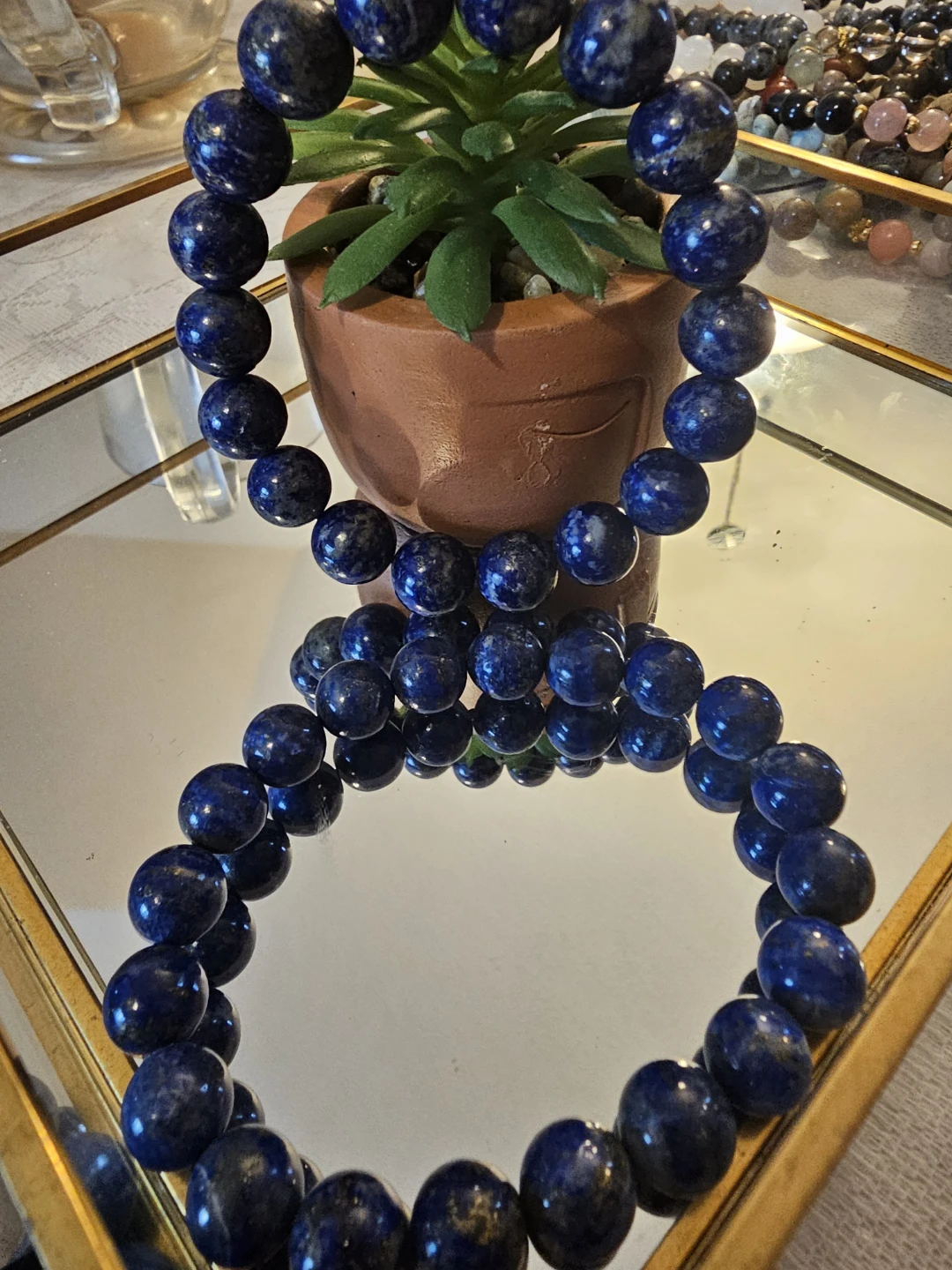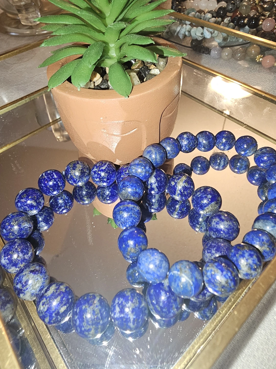 Beautiful lapis lazuli beaded bracelet, perfect for adding a touch of elegance to any outfit! The deep blue colour and unique markings of the lapis lazuli stones make each bracelet one-of-a-kind. Symbolism: Wisdom, truth, power enlightenment, royalty,$25 each
