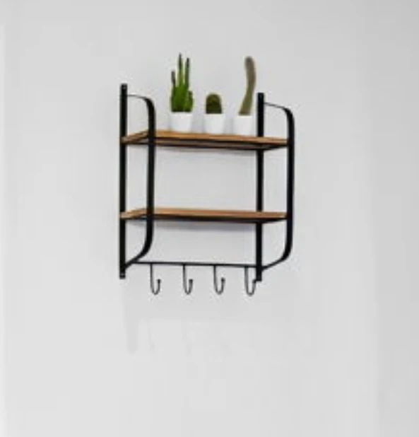 This wall shelf features two wooden tiers for display or storage. It includes a row of five metal hooks below, perfect for hanging keys or small accessories. The black metal frame provides a sturdy and stylish design.