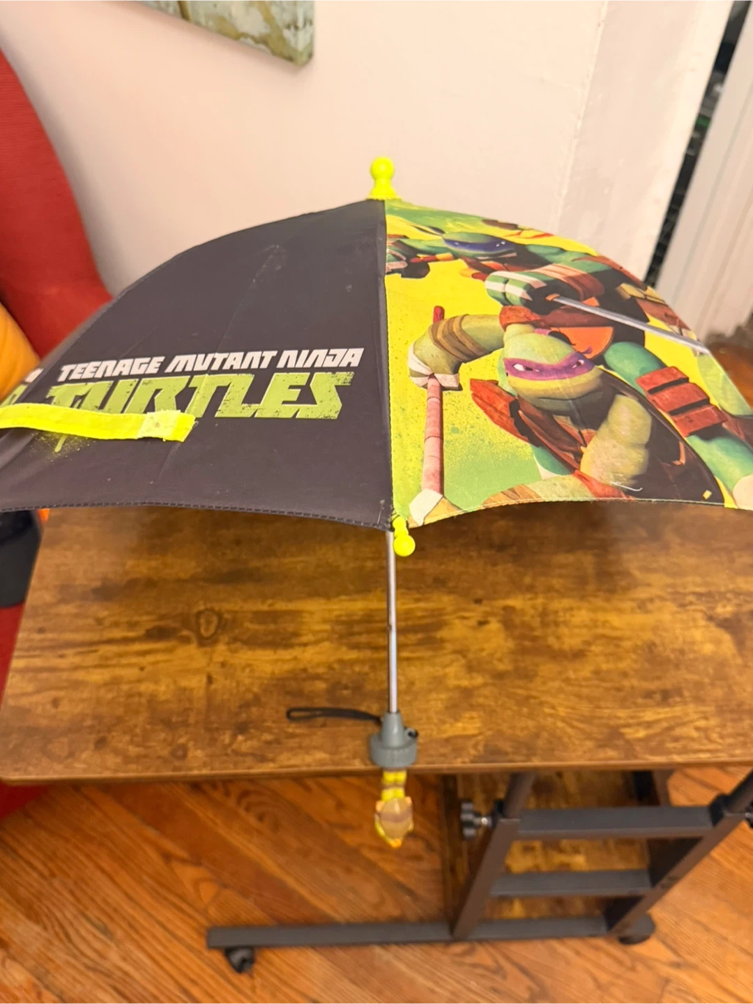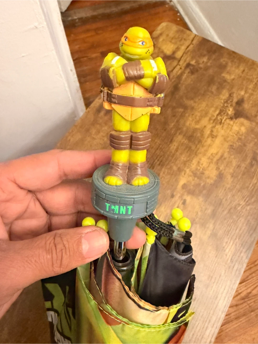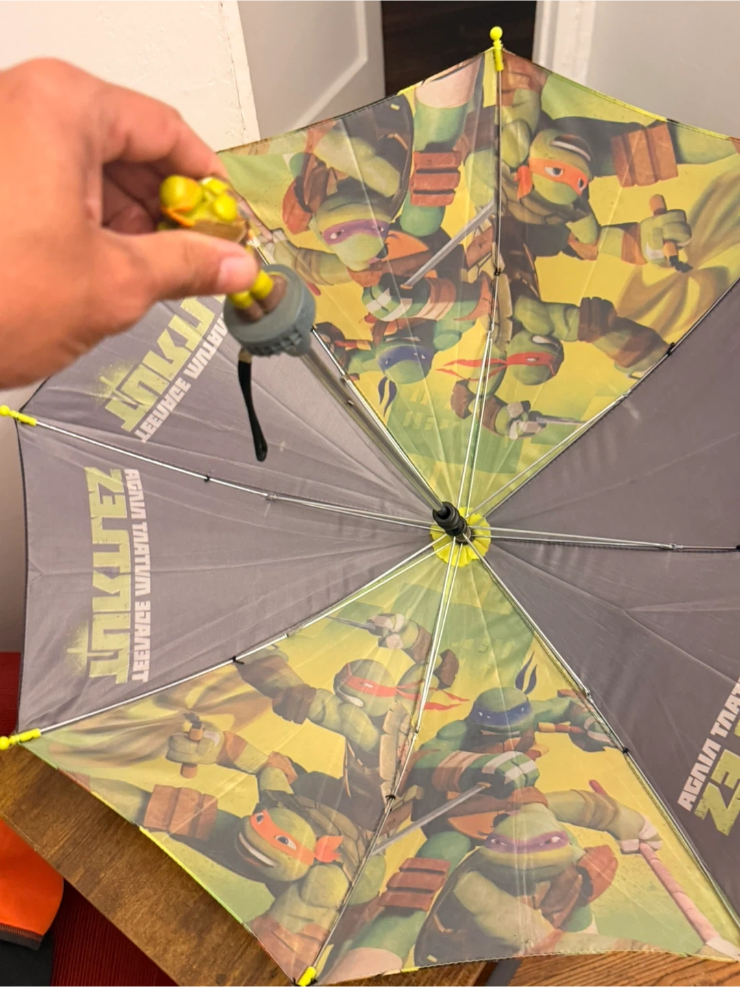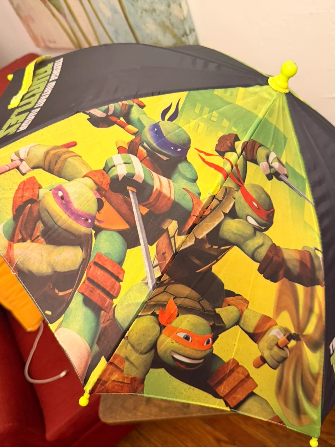 Kids umbrella featuring the Teenage Mutant Ninja Turtles! It has a bright yellow and black design with all four turtles. Perfect for keeping dry on rainy days!