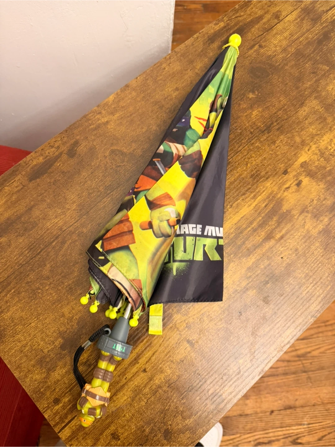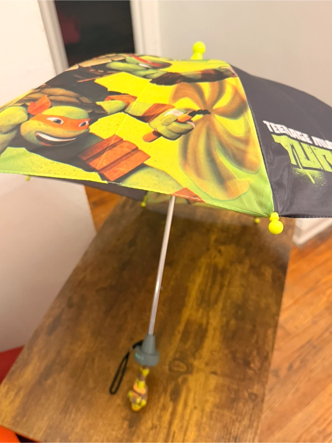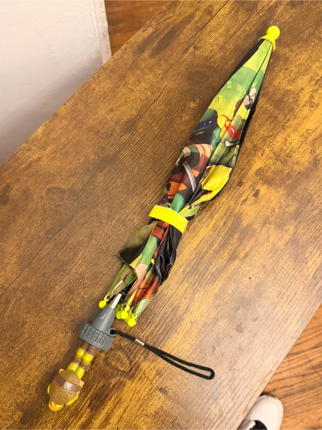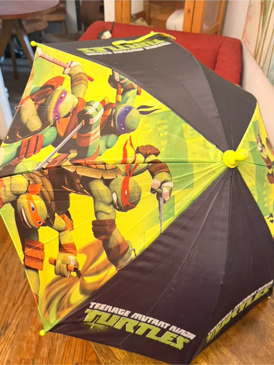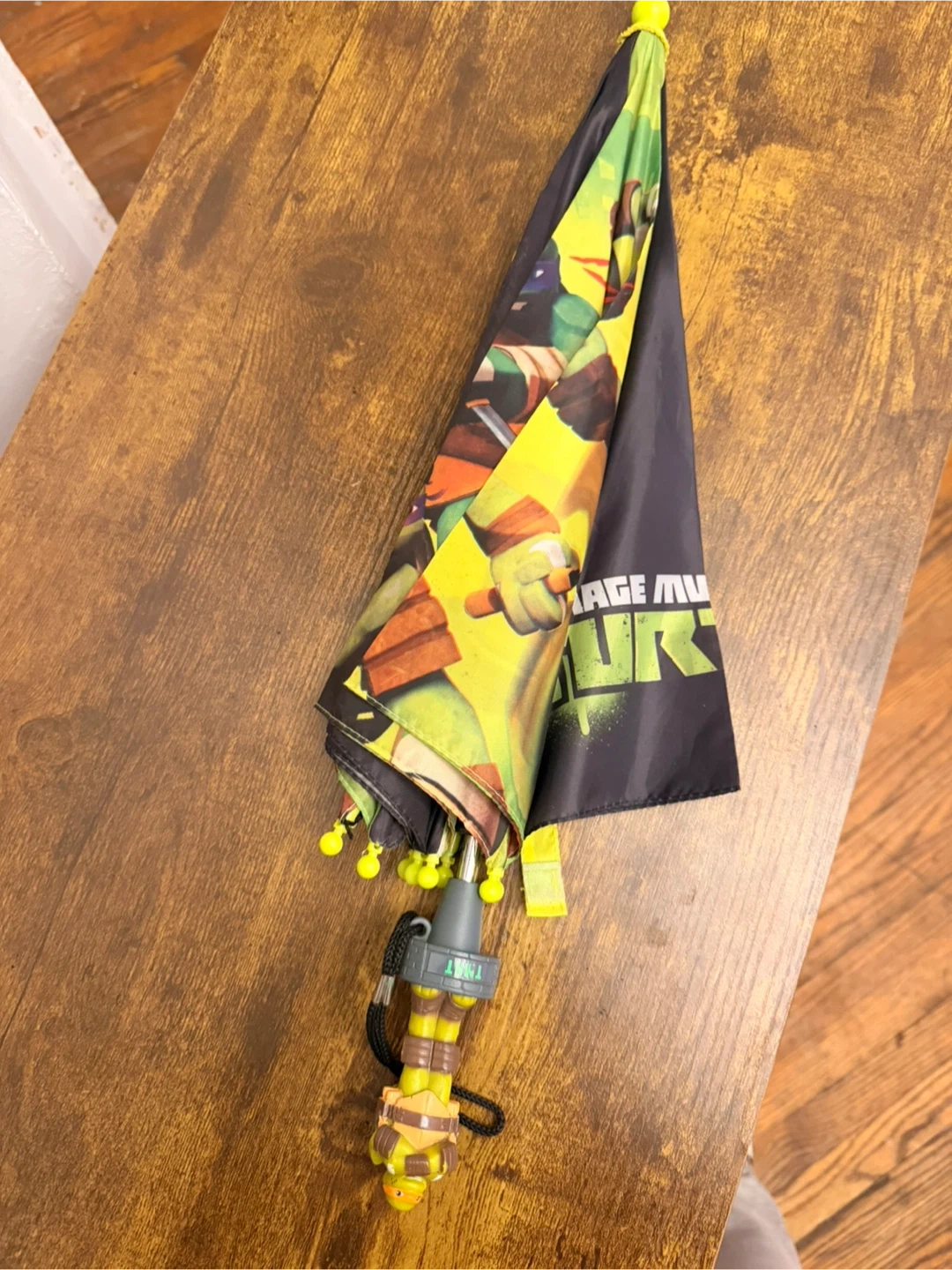 Kids umbrella featuring the Teenage Mutant Ninja Turtles! It has a bright yellow and black design with all four turtles. Perfect for keeping dry on rainy days!