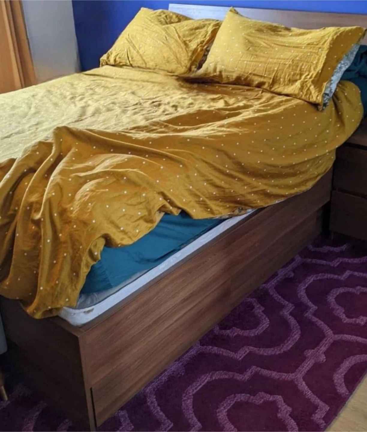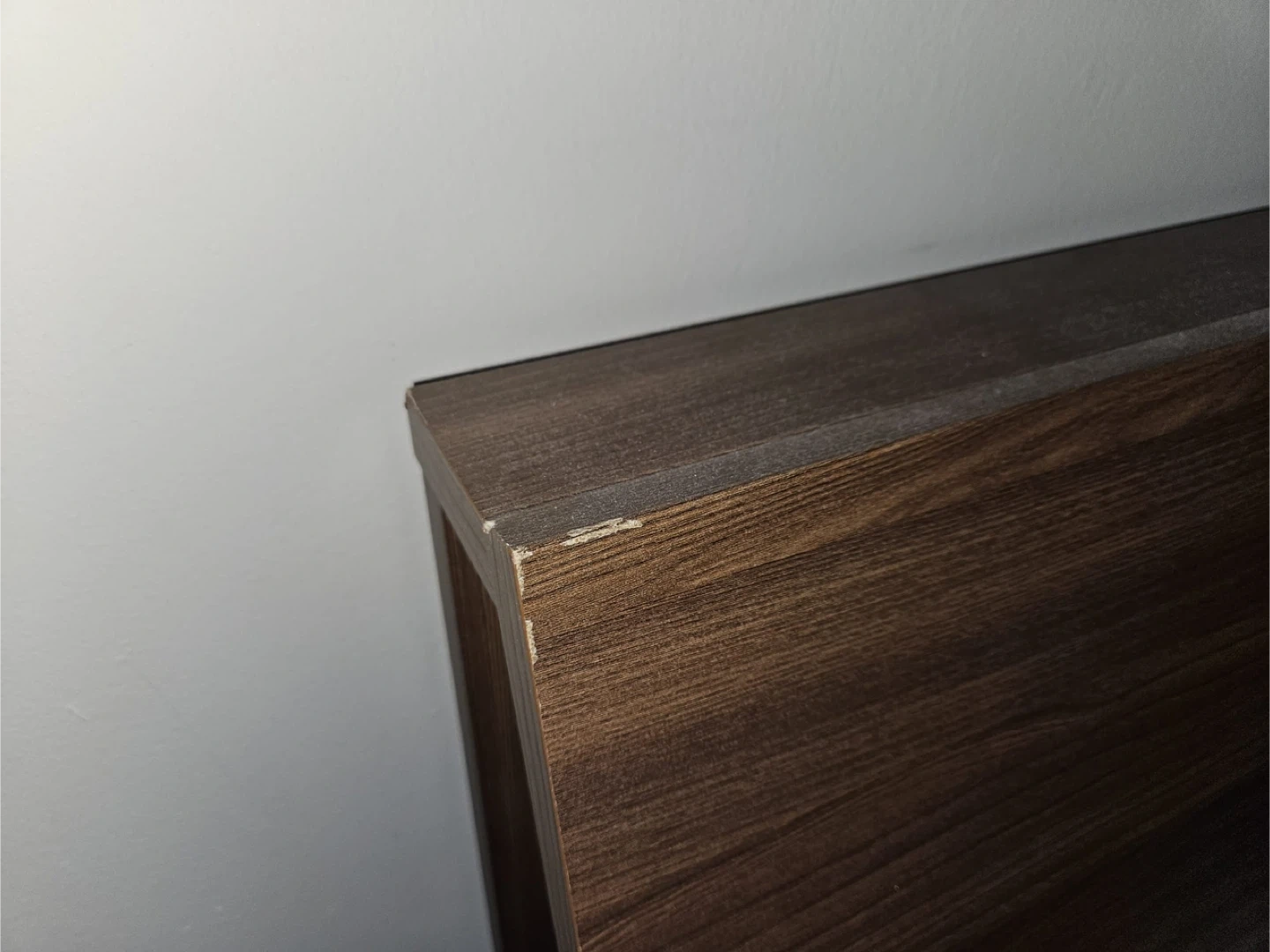 This is an IKEA OPPDAL bed frame. It's a dark wood finish. Some minor wear on the edges, as shown in photos.