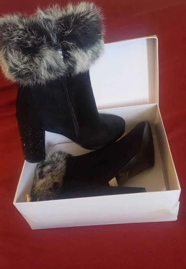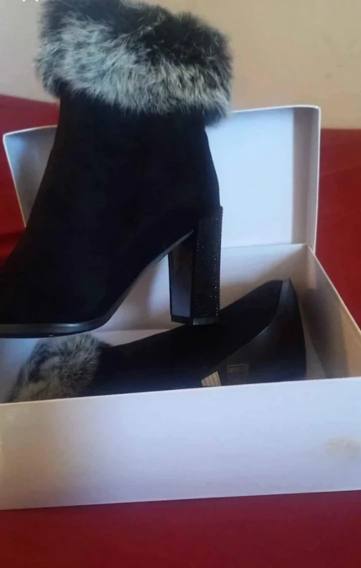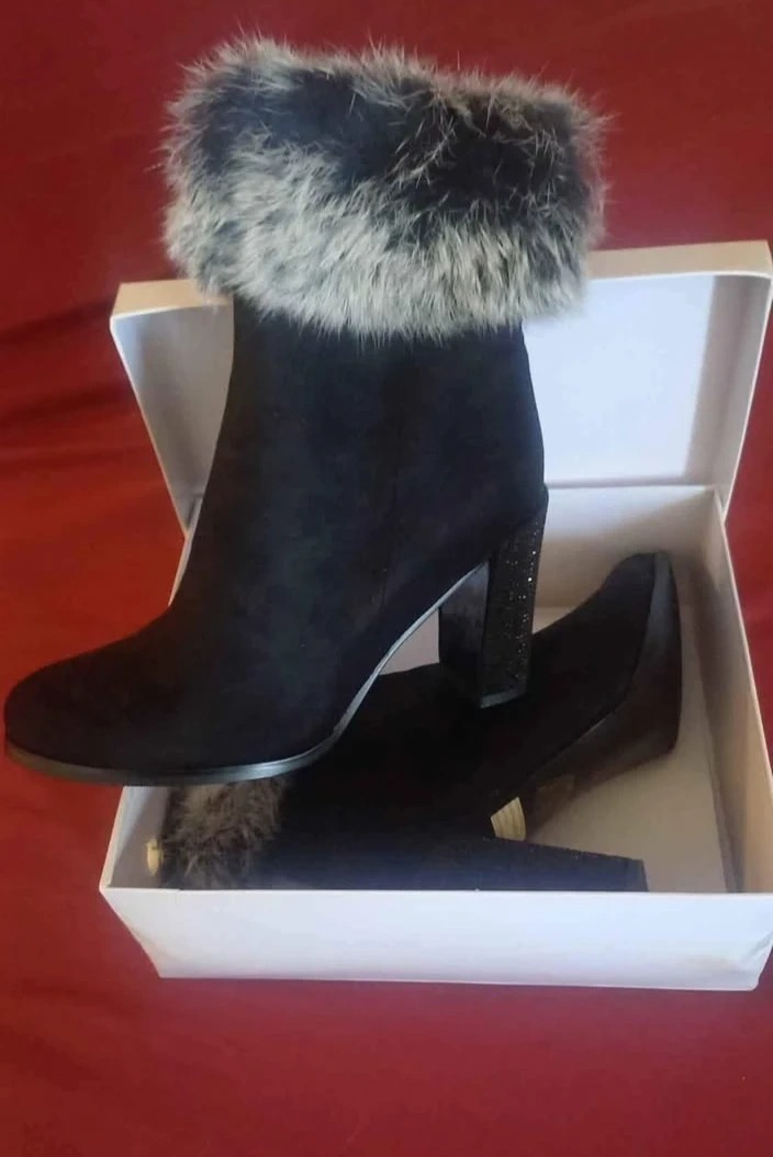 These black ankle boots are in great shape and great price They have a stylish fur trim and a suede finish, perfect for adding a touch of elegance to any outfit