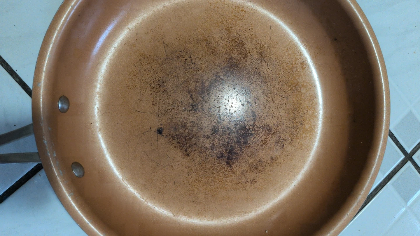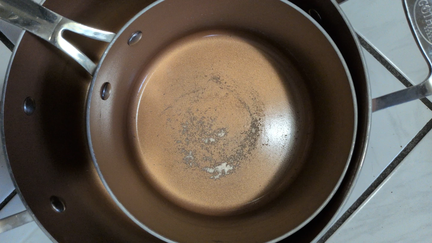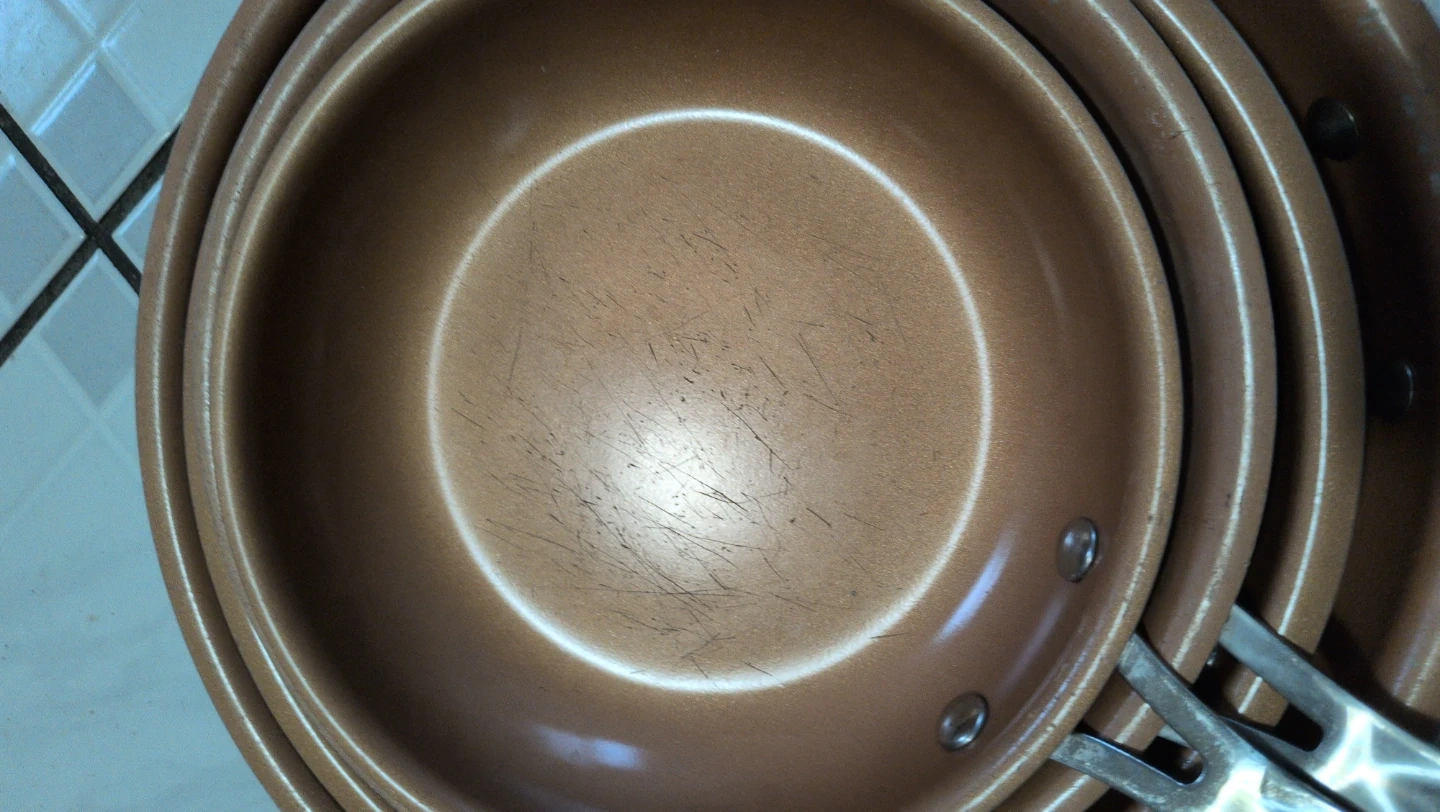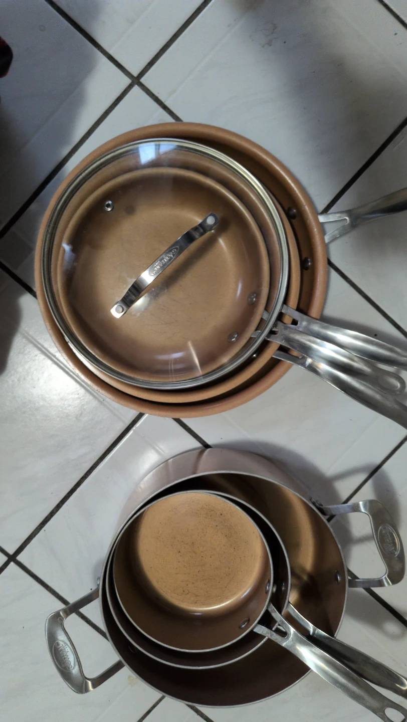 This is a set of three Gotham copper non-stick skillets. The largest skillet measures 10 inches in diameter. They're copper-coloured with stainless steel handles. Some pots and pans have been used a lot more than others but all are usable.