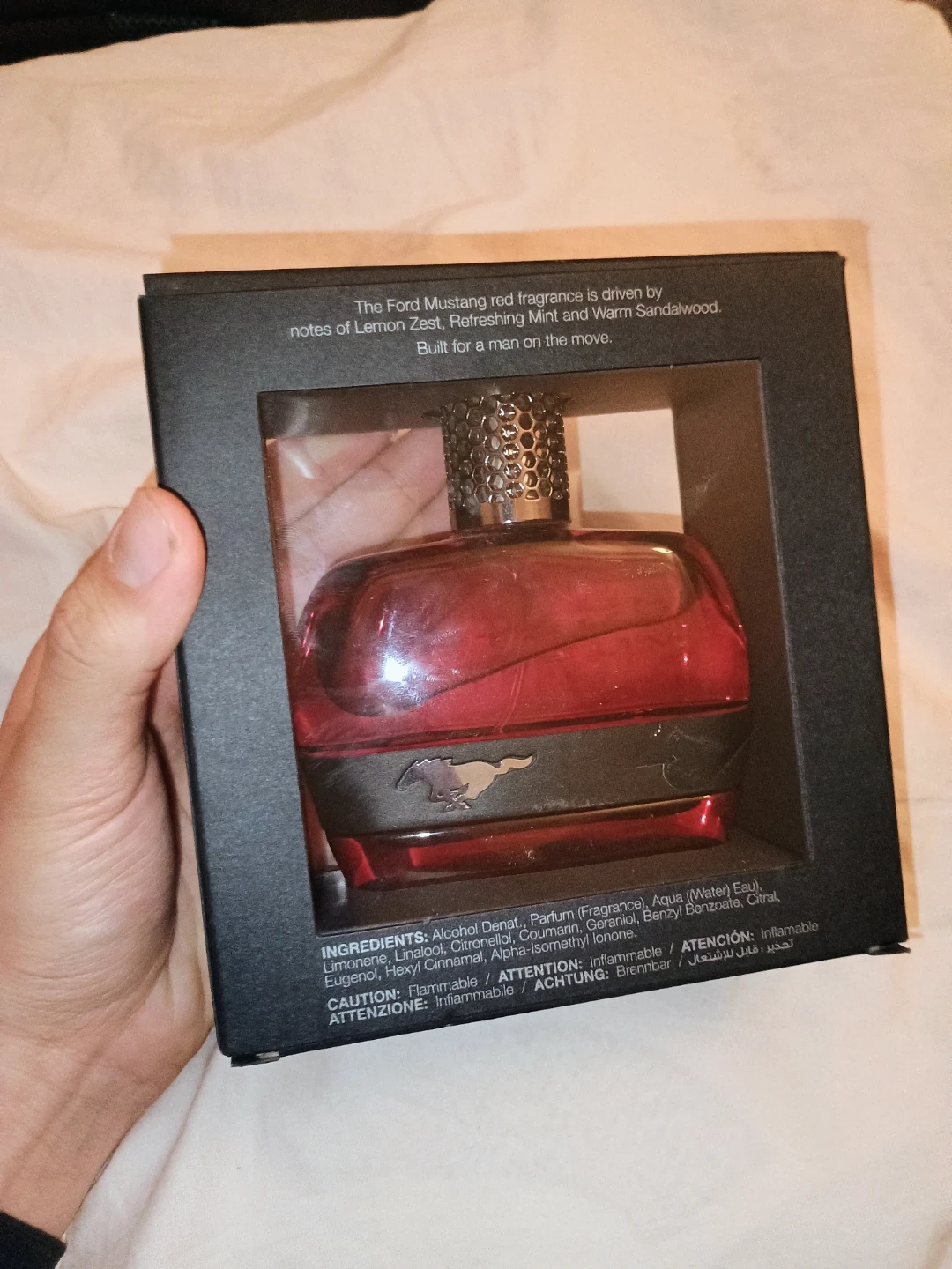 Selling a bottle of Mustang Red Eau de Toilette for men! It's a 3.4 fl oz (100 ml) bottle. The fragrance is driven by notes of Lemon Zest, Refreshing Mint, and Warm Sandalwood, built for a man on the move. Comes in its original box