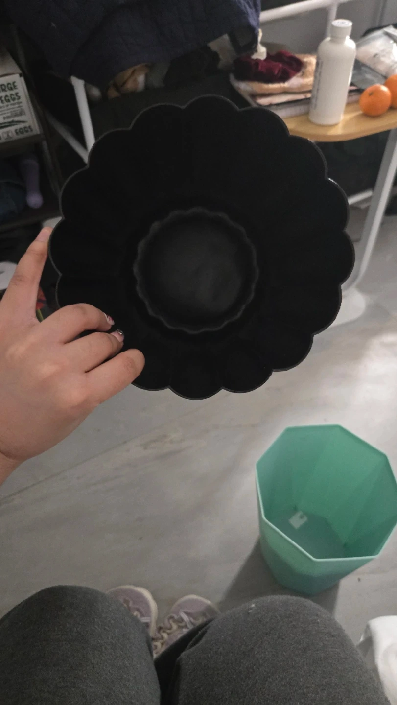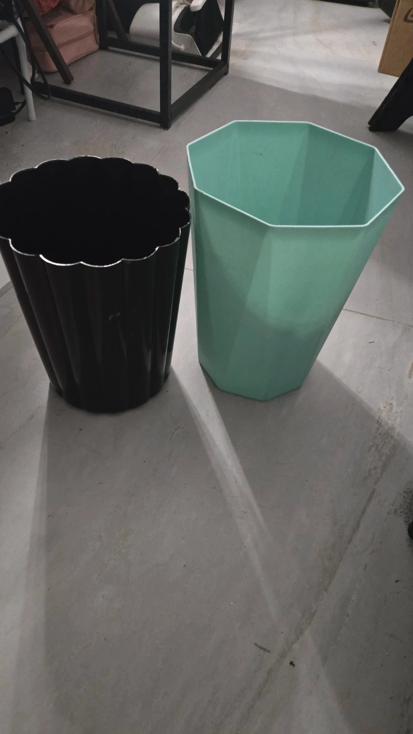 Selling two trash can for bathroom or room. One is black with a scalloped edge, and the other is a light green with a geometric design. They are both in good condition
