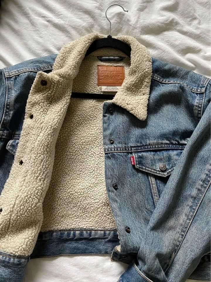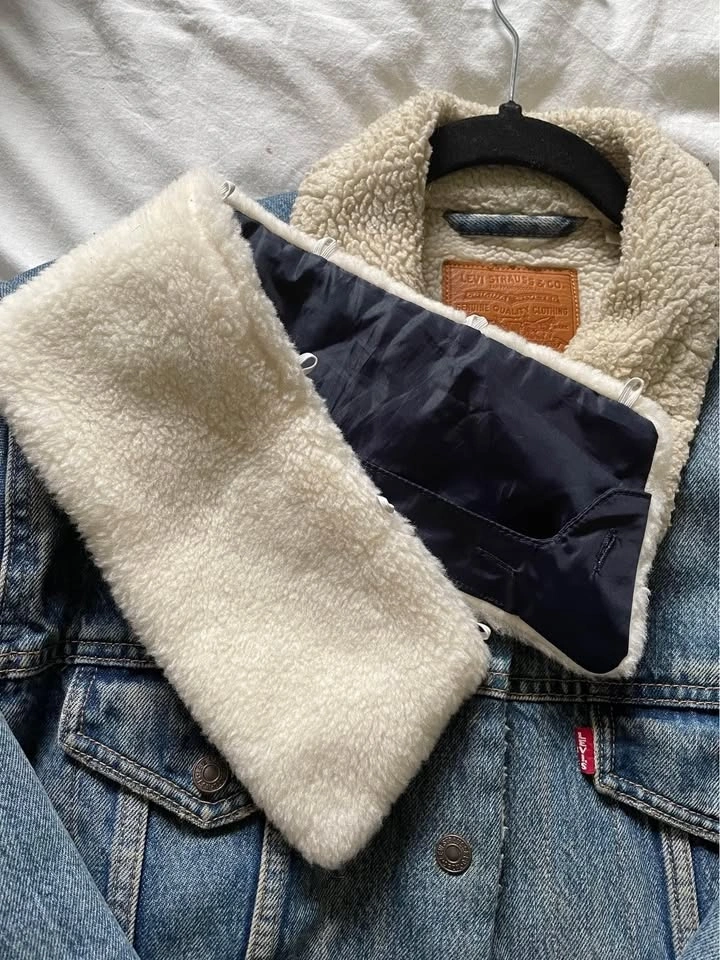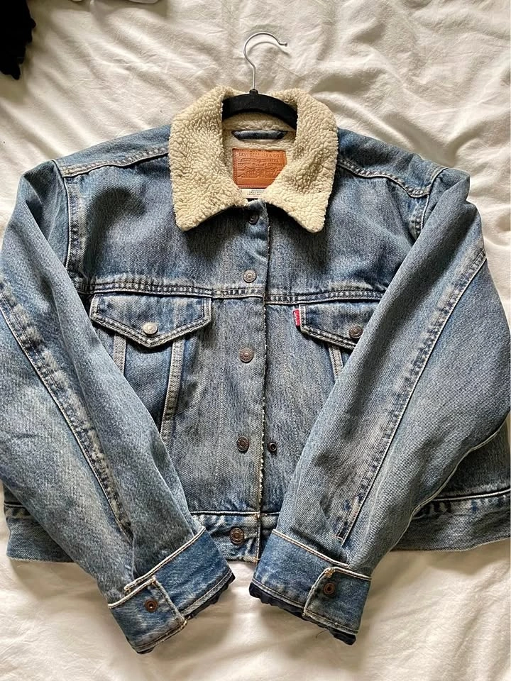 Oversized cropped denim jacket, size L (fits like a medium). It has a cropped, boxy fit. Comes with a collar attachment. No flaws. Pick up in Bolton.