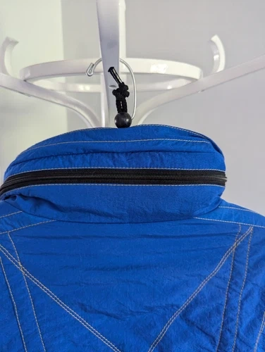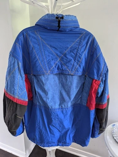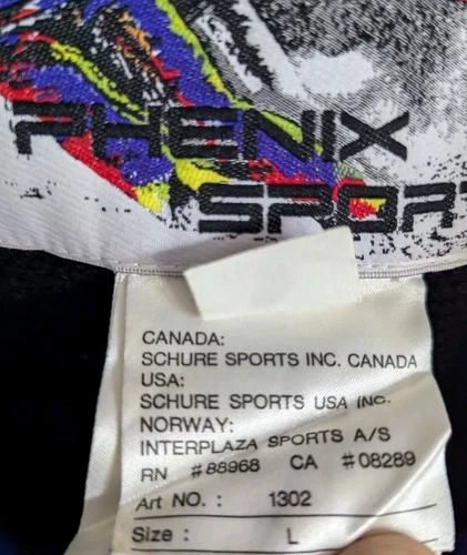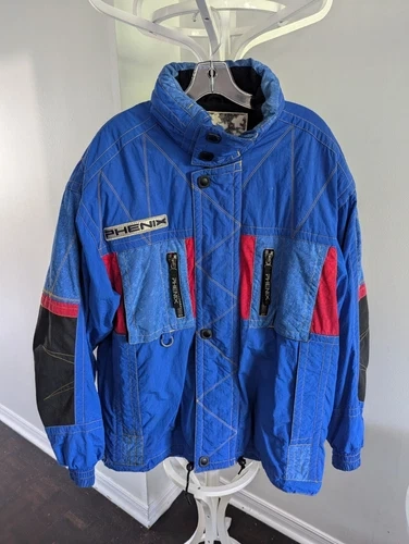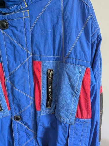 Get ready for the slopes with this rare vintage Phenix Sports ski suit. Made of softshell nylon fabric, this two-piece snowsuit in blue, red, and black is perfect for skiing and snowboarding. The hipster, retro 80s aspen resort style will make you stand out on the slopes. The suit comes in size L and features a hood for added warmth. The outer shell material is durable and the accents with shells add a stylish touch. The suit is perfect for anyone looking for a quality, vintage snowsuit for their next ski trip. Don't miss out on this one-of-a-kind snowsuit.