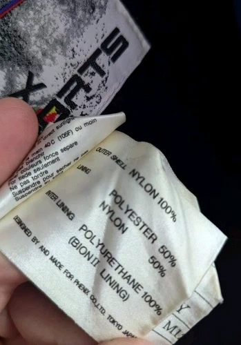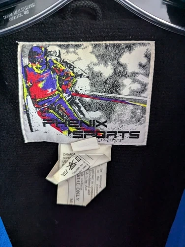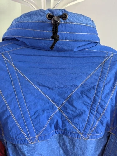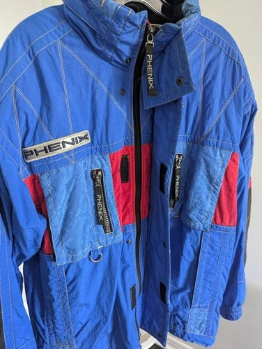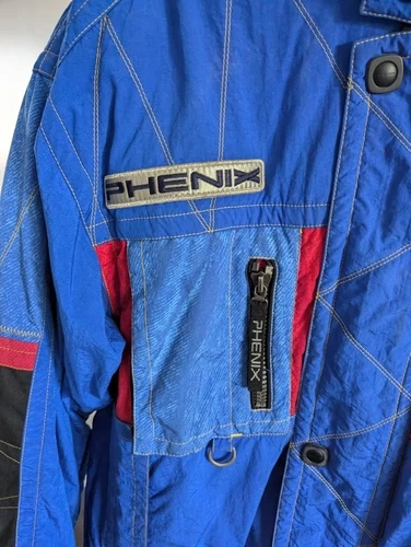 Get ready for the slopes with this rare vintage Phenix Sports ski suit. Made of softshell nylon fabric, this two-piece snowsuit in blue, red, and black is perfect for skiing and snowboarding. The hipster, retro 80s aspen resort style will make you stand out on the slopes. The suit comes in size L and features a hood for added warmth. The outer shell material is durable and the accents with shells add a stylish touch. The suit is perfect for anyone looking for a quality, vintage snowsuit for their next ski trip. Don't miss out on this one-of-a-kind snowsuit.