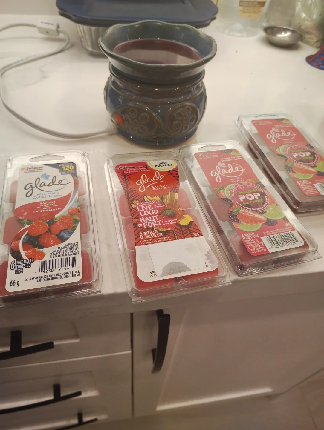Electric wax melts warmer and 22 glade wax melts in different scents. Includes Radiant Berries, Live Loud, and Strawberry Pop.