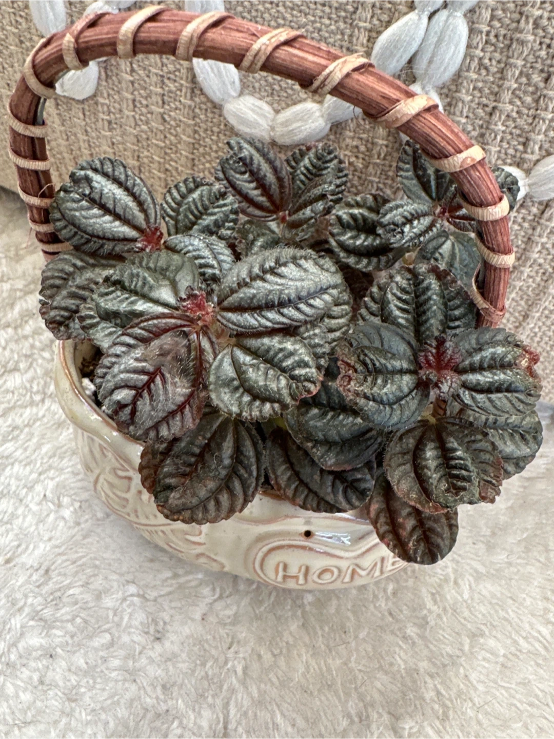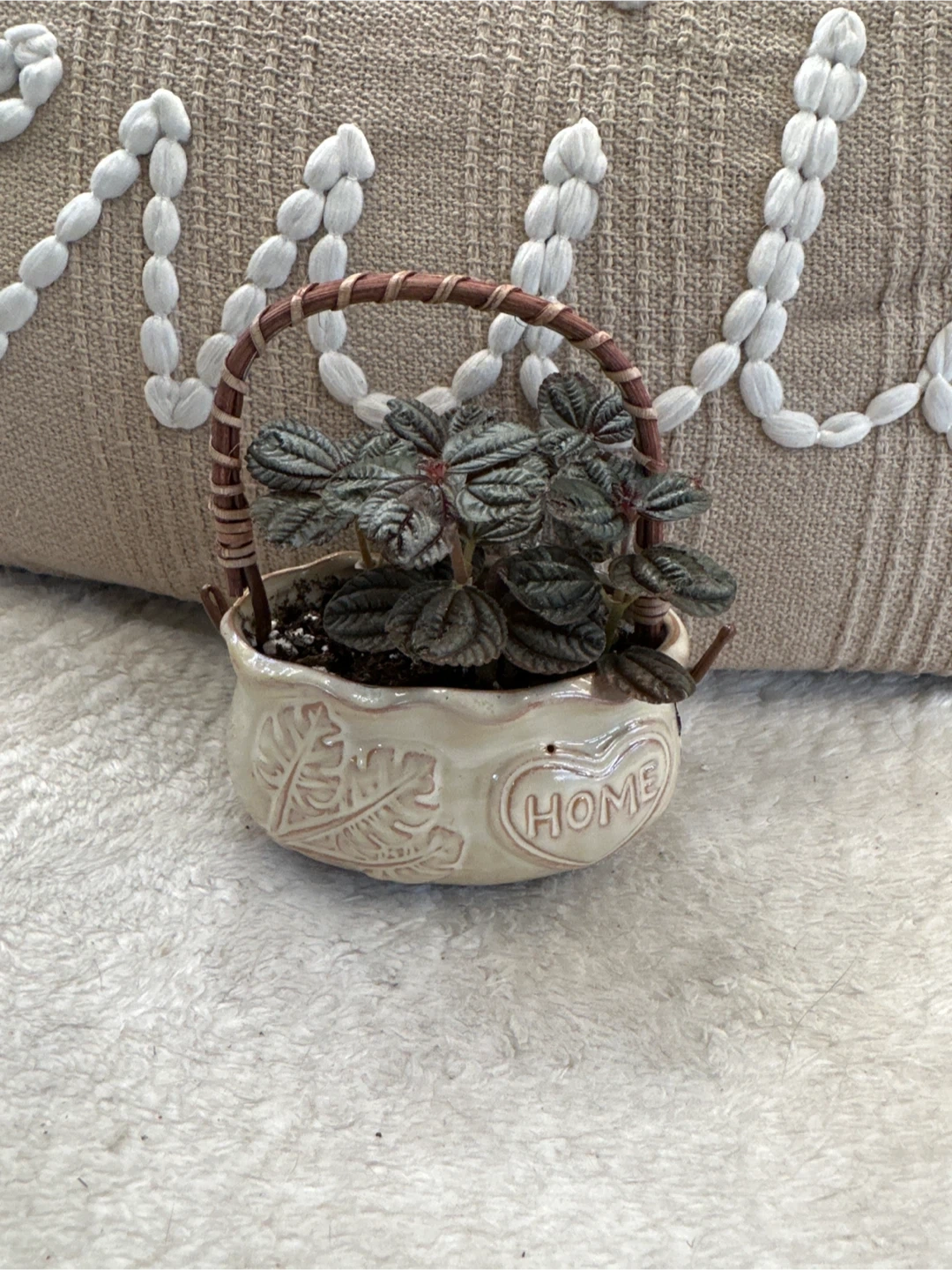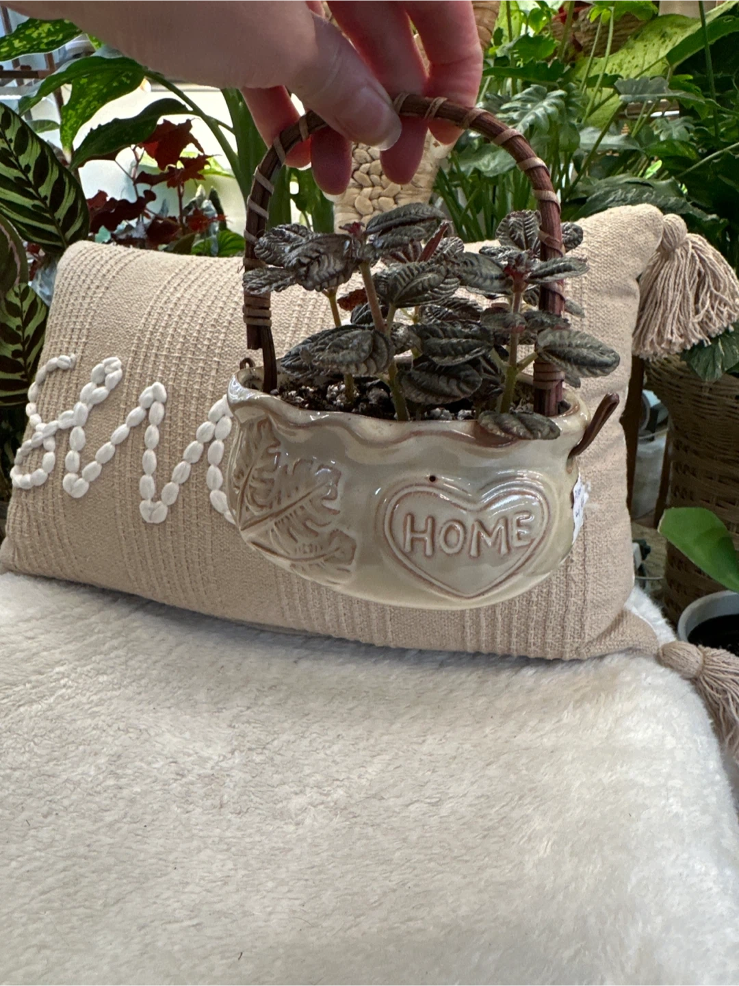 Small potted pilea bronze plant in a decorative ceramic basket. The basket has a woven handle and is embossed with Monstera leaves and the word "HOME". It's a charming piece for any home and includes bottom drainage and a pkg to protect your furniture