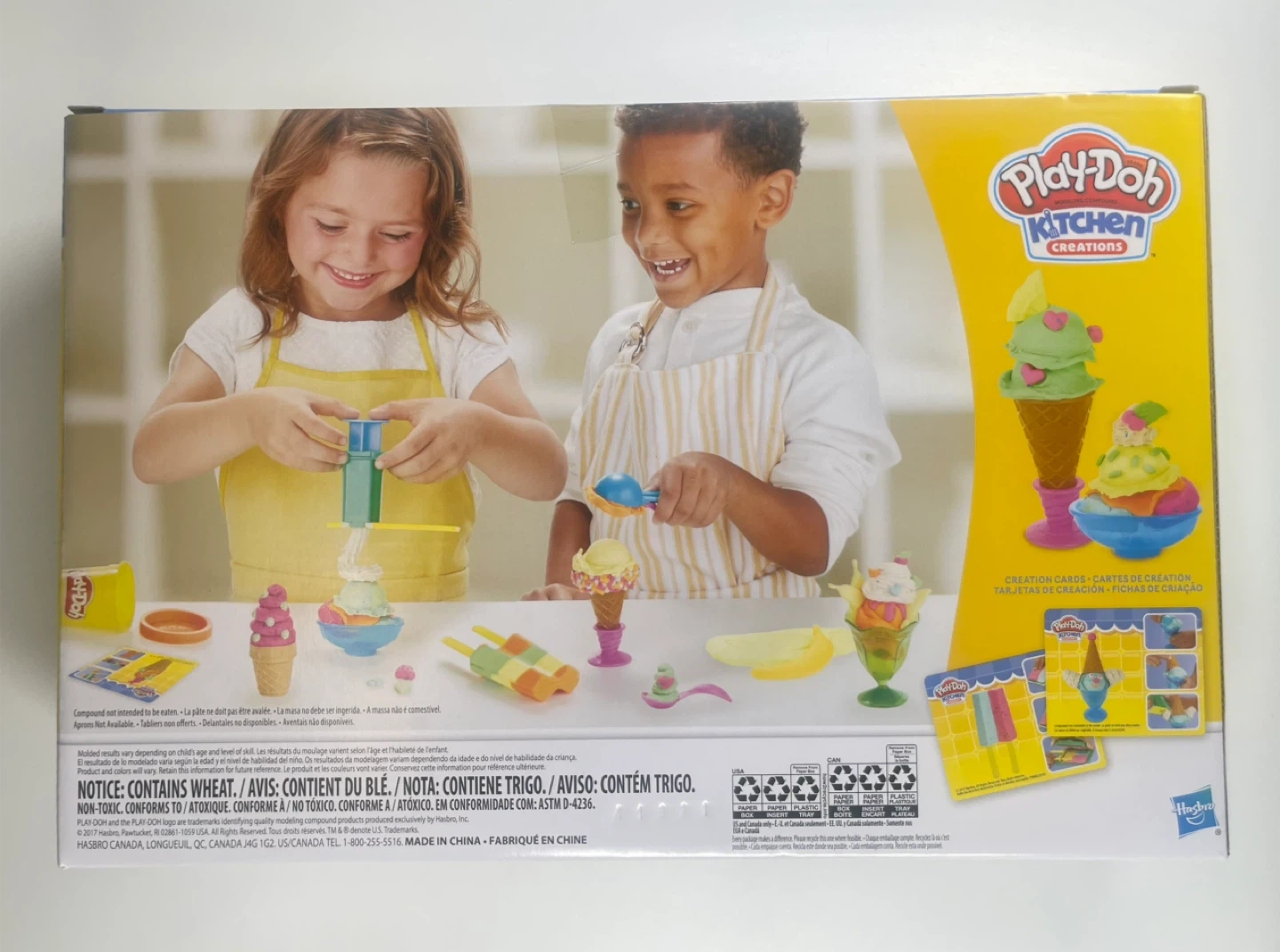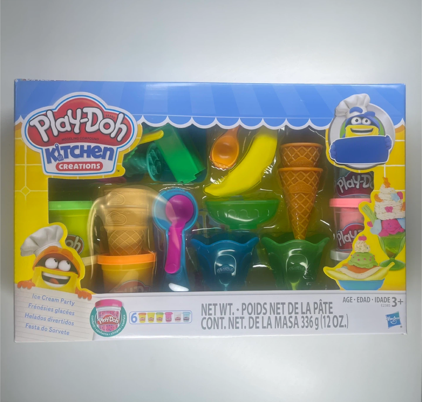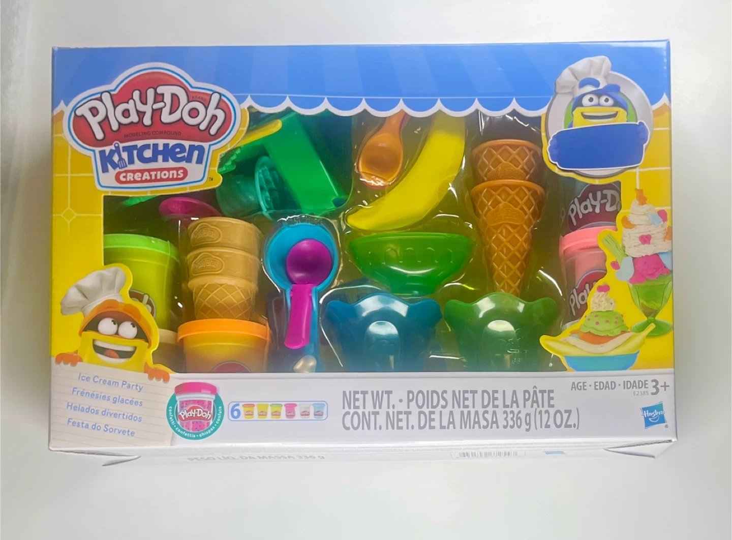 Create endless colorful ice cream treats with 22 Play-Doh tools, 6 non-toxic colors, confetti dough, cones, scoops, and fun toppings!