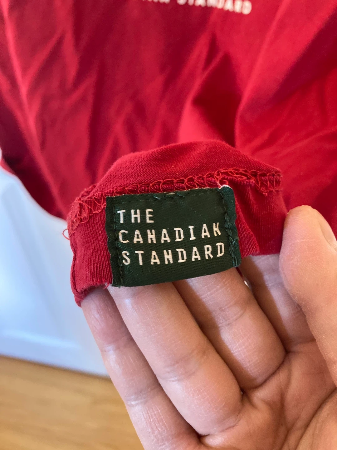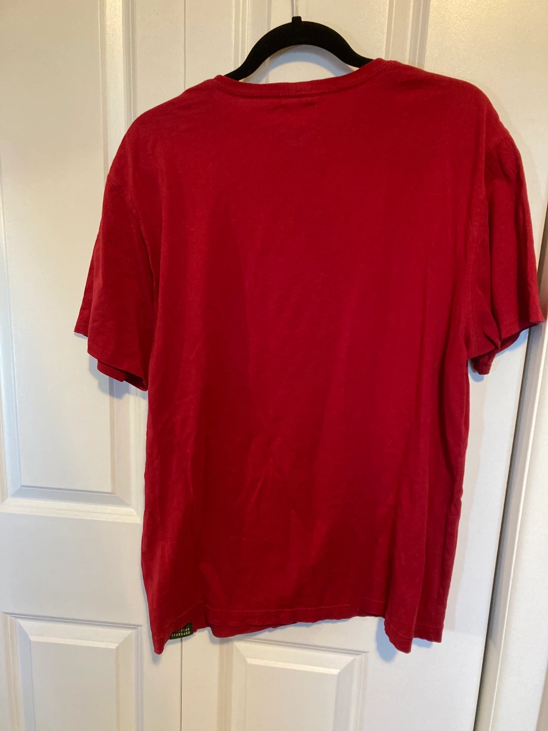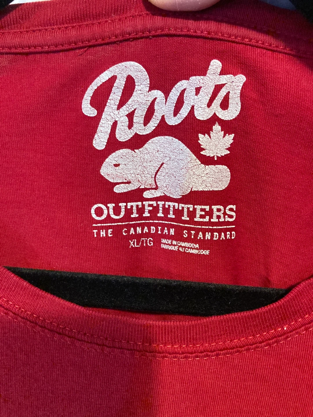 Red Roots Outfitters t-shirt with "Roots Canada The Canadian Standard" graphic. Made of 100% cotton. Size XL/TG. Perfect for casual wear!