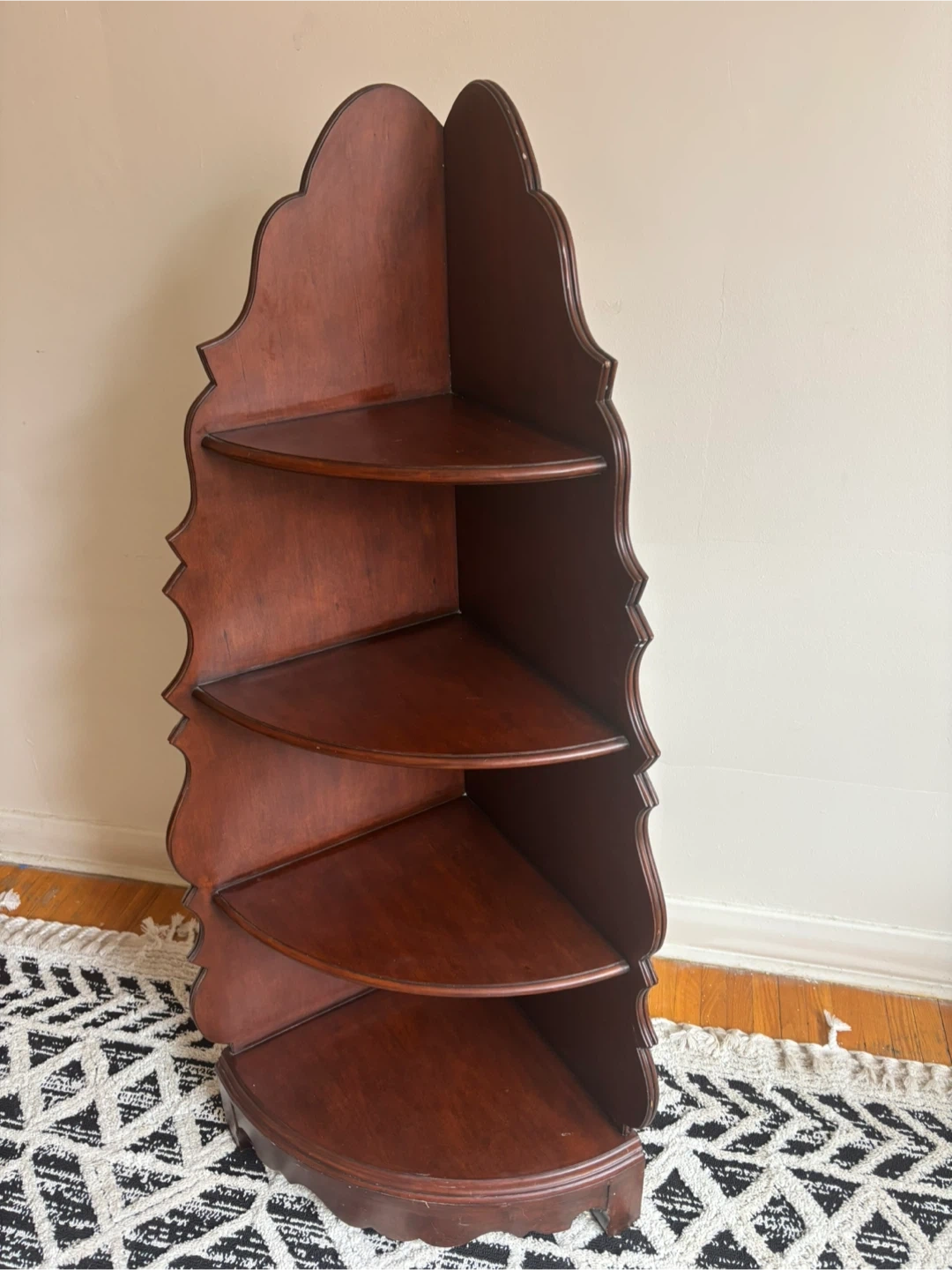 This is a dark wood corner shelf unit with four tiers. It's a great way to display items or store books. The scalloped edges add a decorative touch.