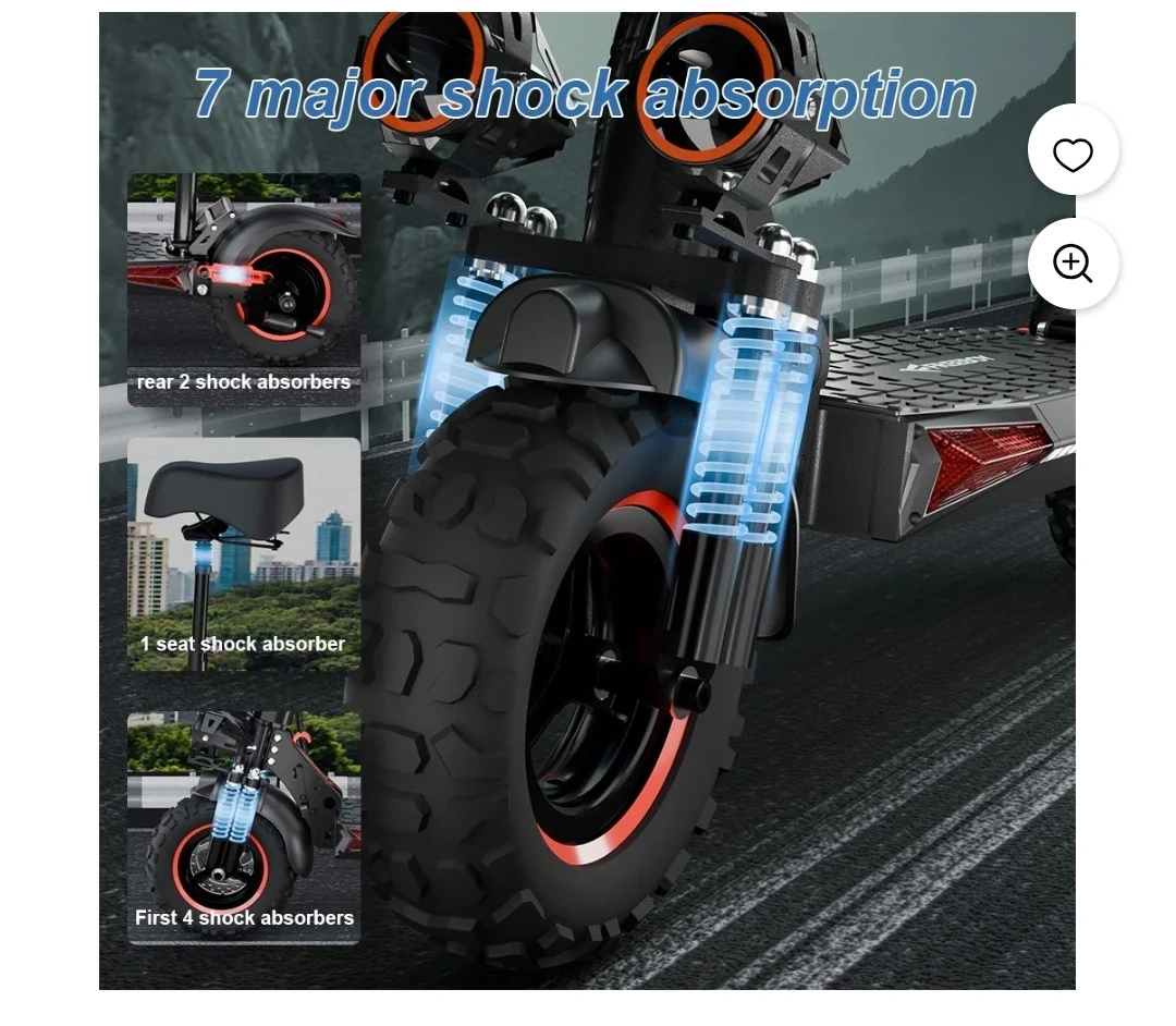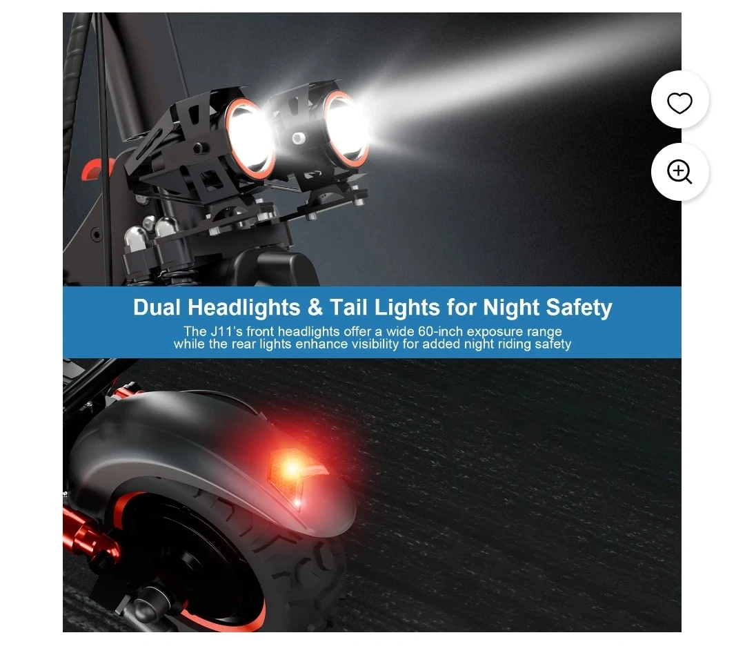 This electric scooter boasts dual headlights and tail lights for enhanced night safety. It features 7 major shock absorption points and pro-grade hydraulic double disc brakes for a stable ride. Includes a removable seat for added comfort.