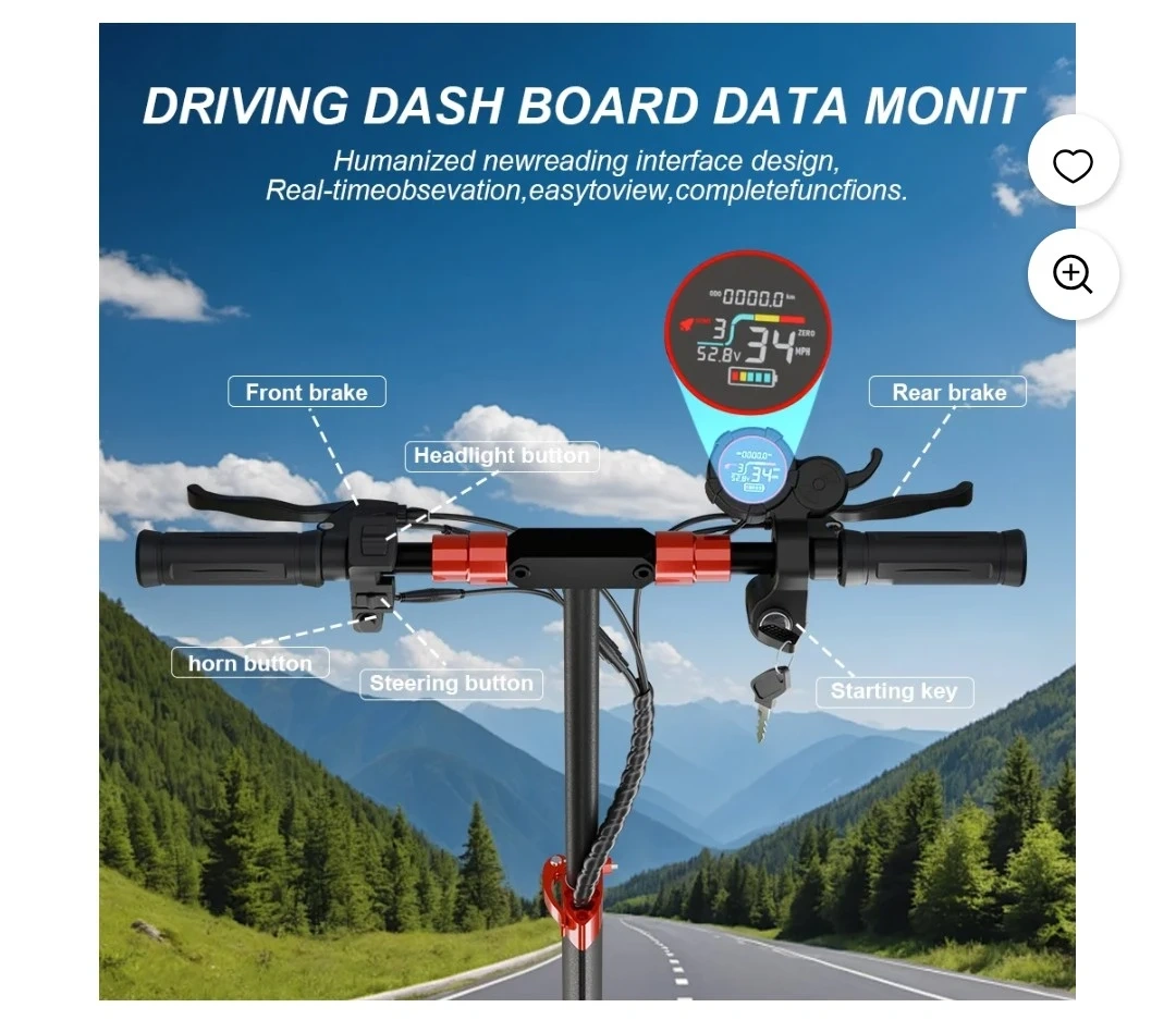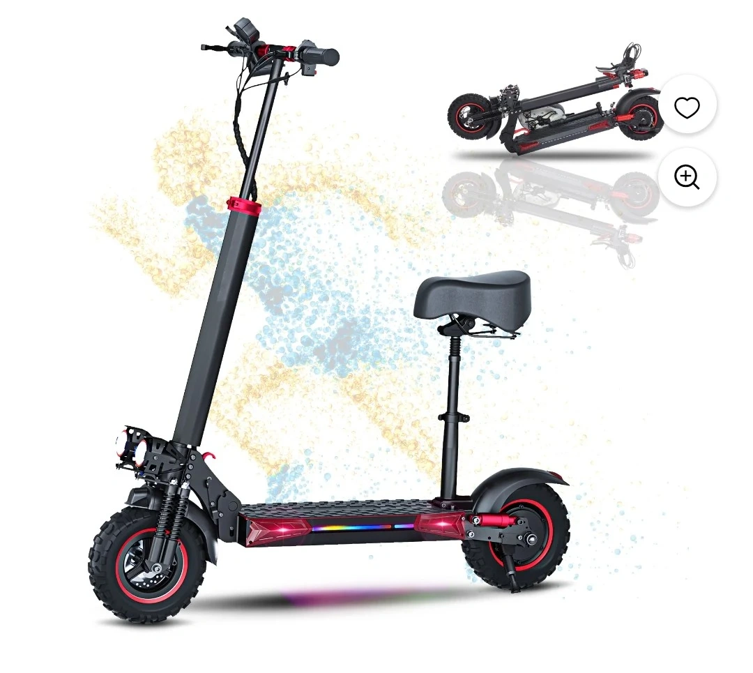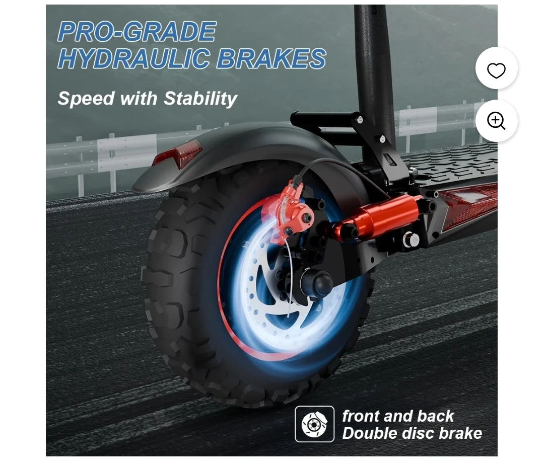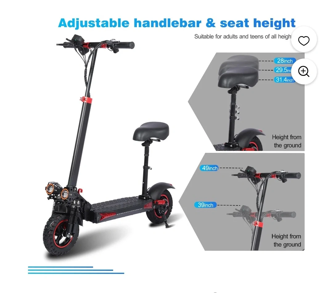 This electric scooter boasts dual headlights and tail lights for enhanced night safety. It features 7 major shock absorption points and pro-grade hydraulic double disc brakes for a stable ride. Includes a removable seat for added comfort.