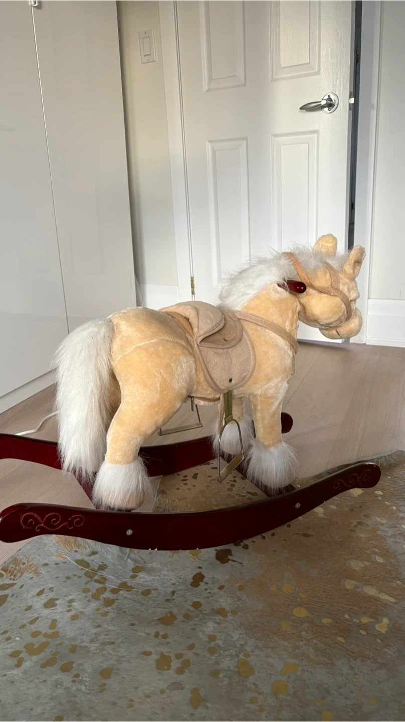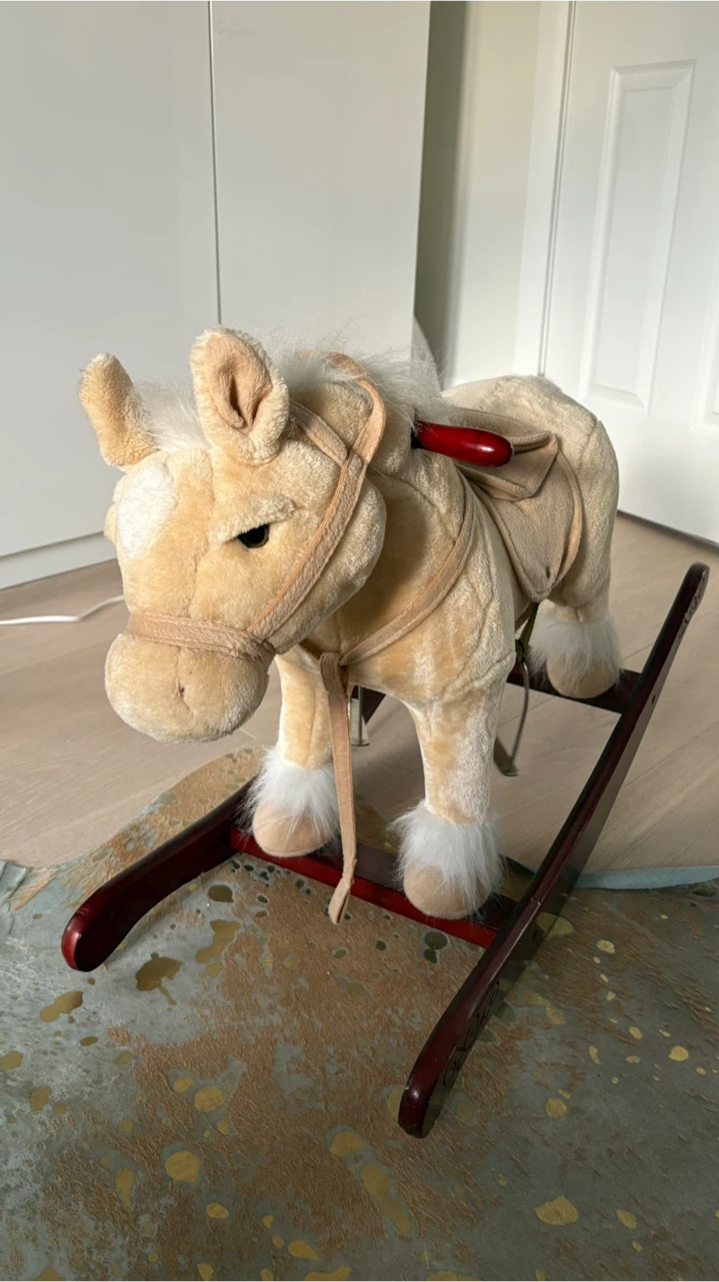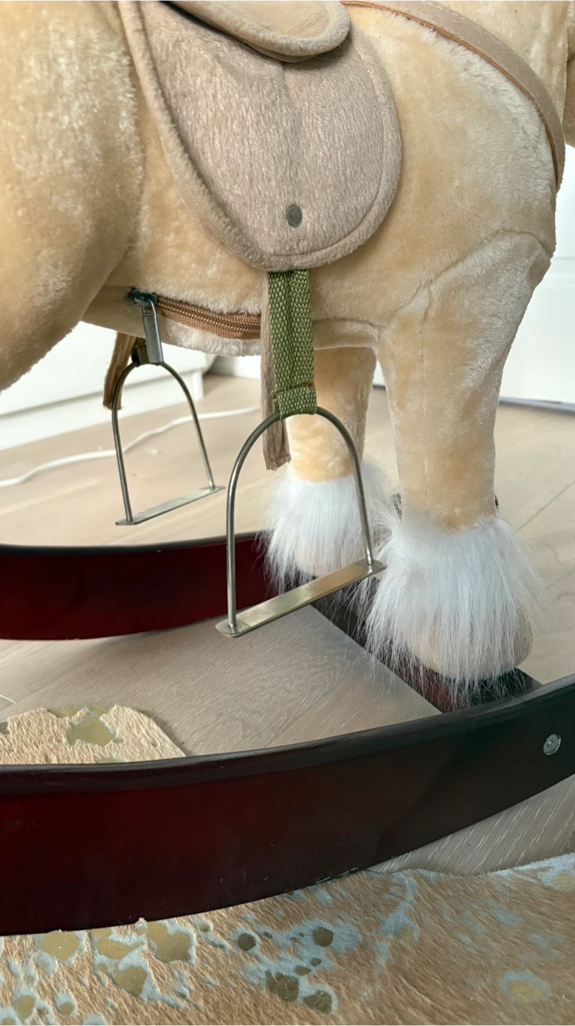 Selling a rocking horse in good condition! It's a charming addition to any playroom or nursery. The horse is beige and features a saddle and stirrups for added fun. The rocking base is a dark red colour with decorative carvings on the side
