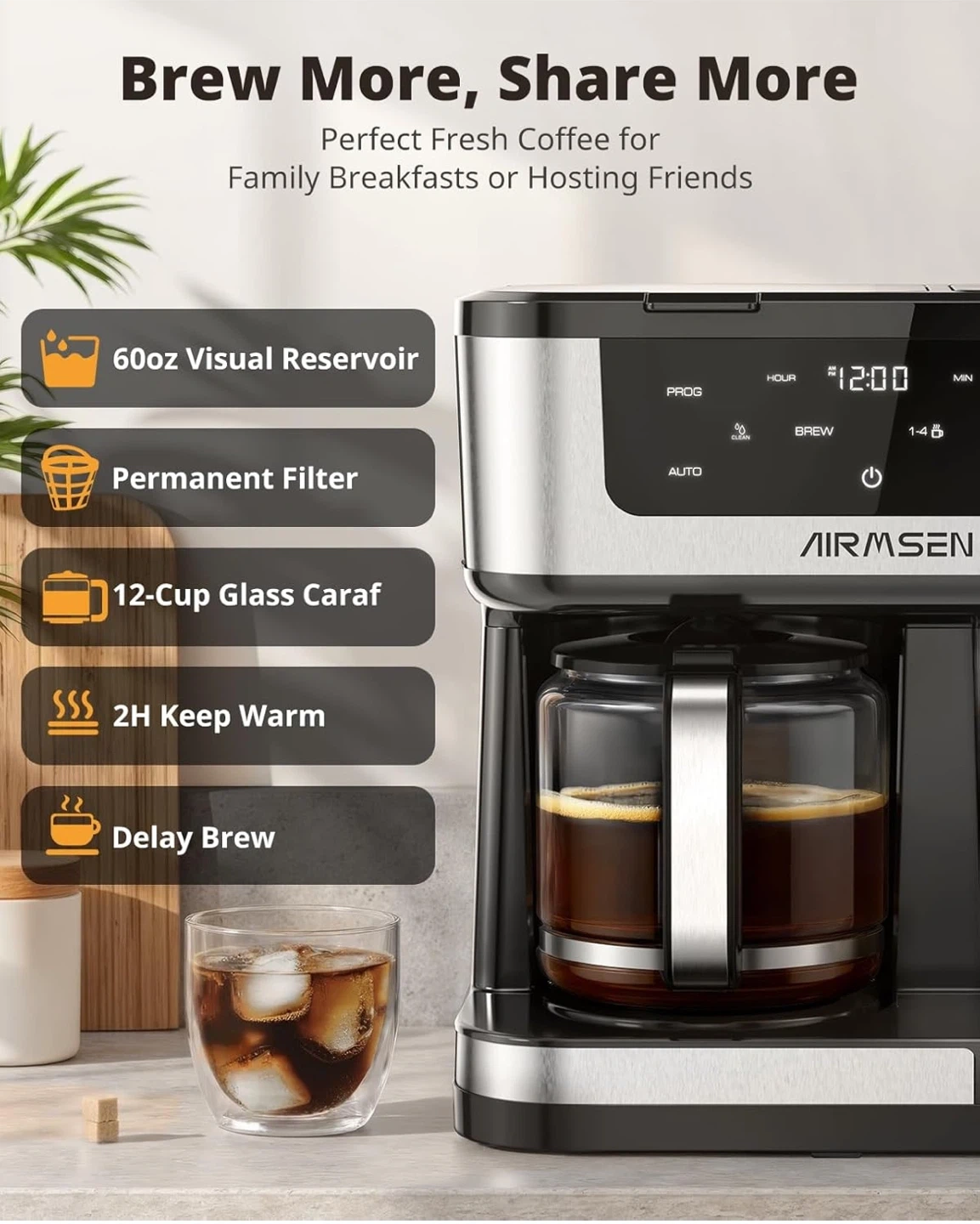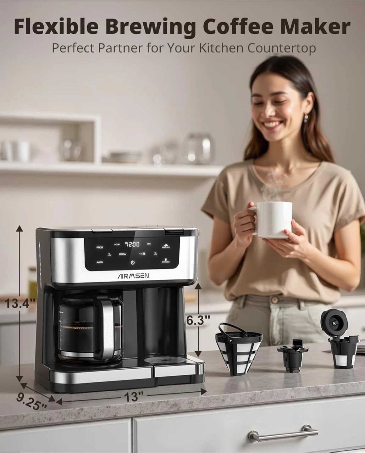 AIRMSEN Dual Coffee Maker and K Cup Combo: One cup to satisfy the whole family's preferences. Say goodbye to the era of multiple coffee machines taking up kitchen countertops! The AIRMSEN 2-in-1 coffee combo perfectly combines two of the most popular brewing methods into one stylish machine. Whether you're preparing a large pot of coffee for a family gathering or quickly making a refreshing cup for yourself, it can handle it all with ease.