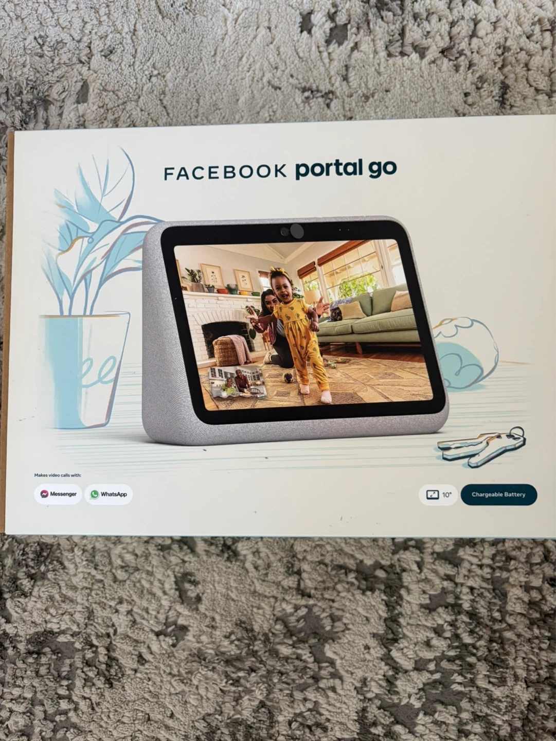 This portable smart video device lets you have video calls anywhere around your home. It features a 10" display and a rechargeable battery for convenience. It connects with Messenger and WhatsApp for easy communication.