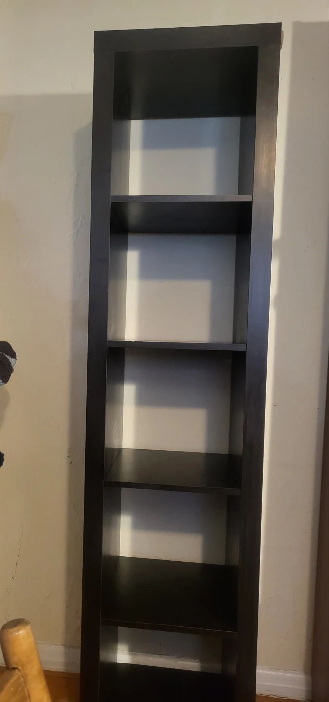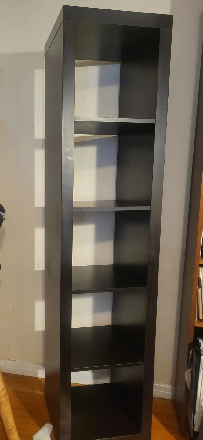 A tall, black bookcase with five shelves. It's perfect for storing books and displaying decor. A little wobbly needs some screws tightened.