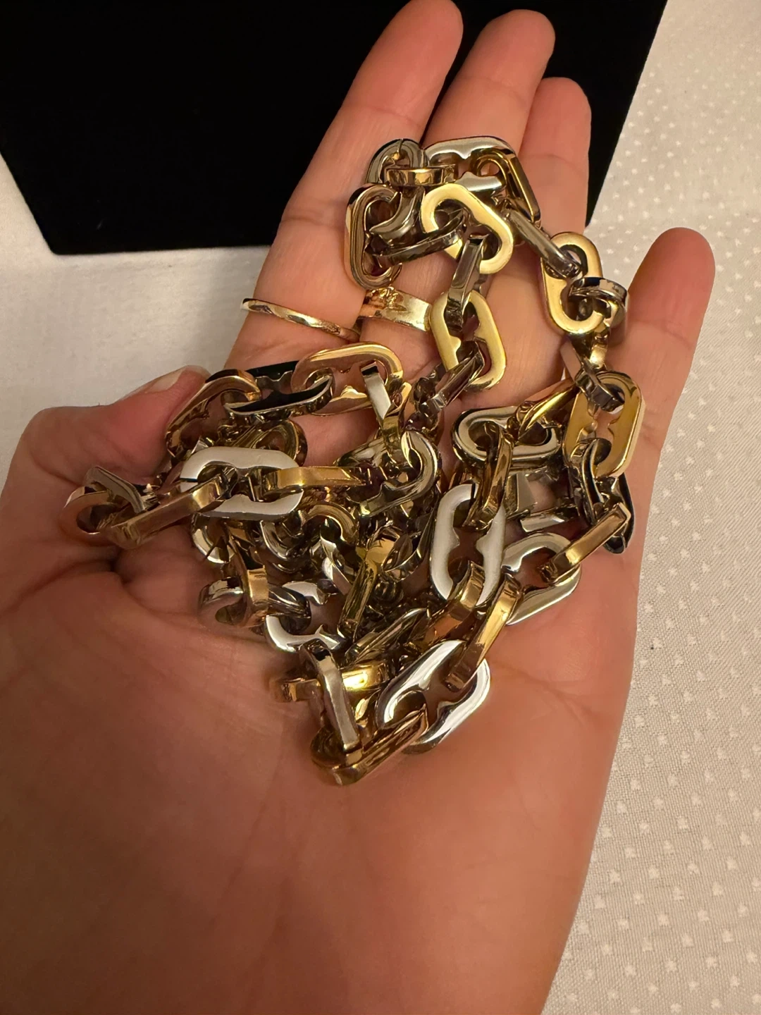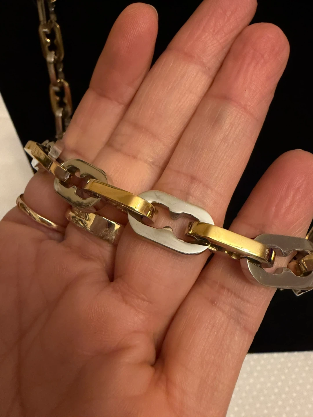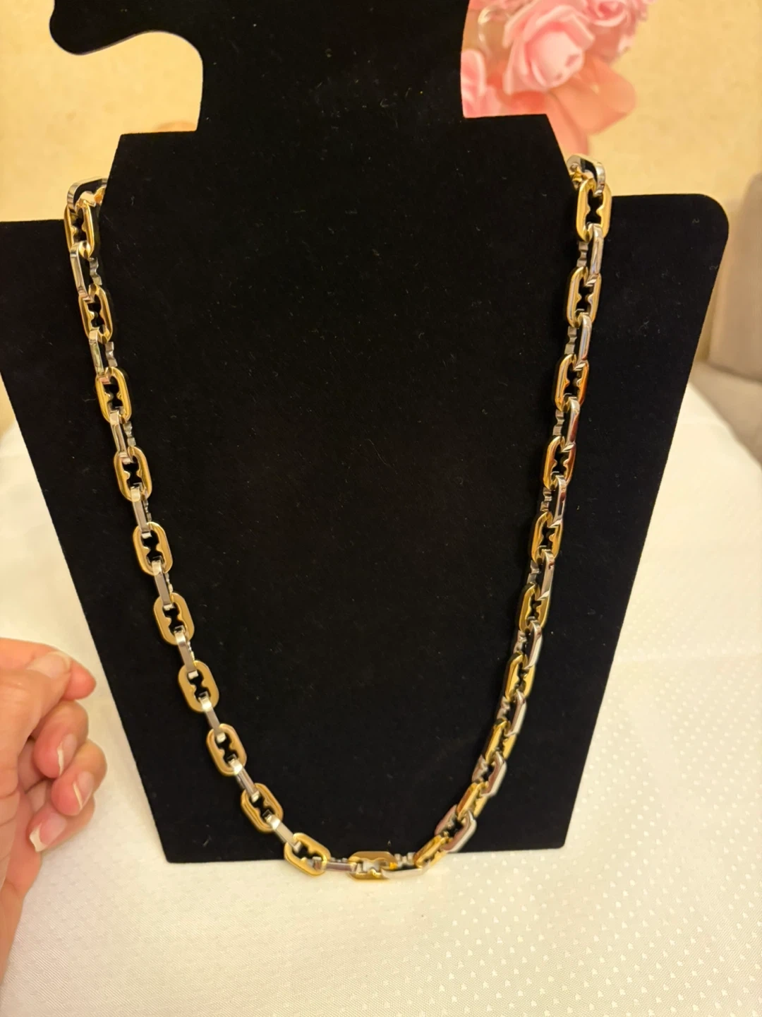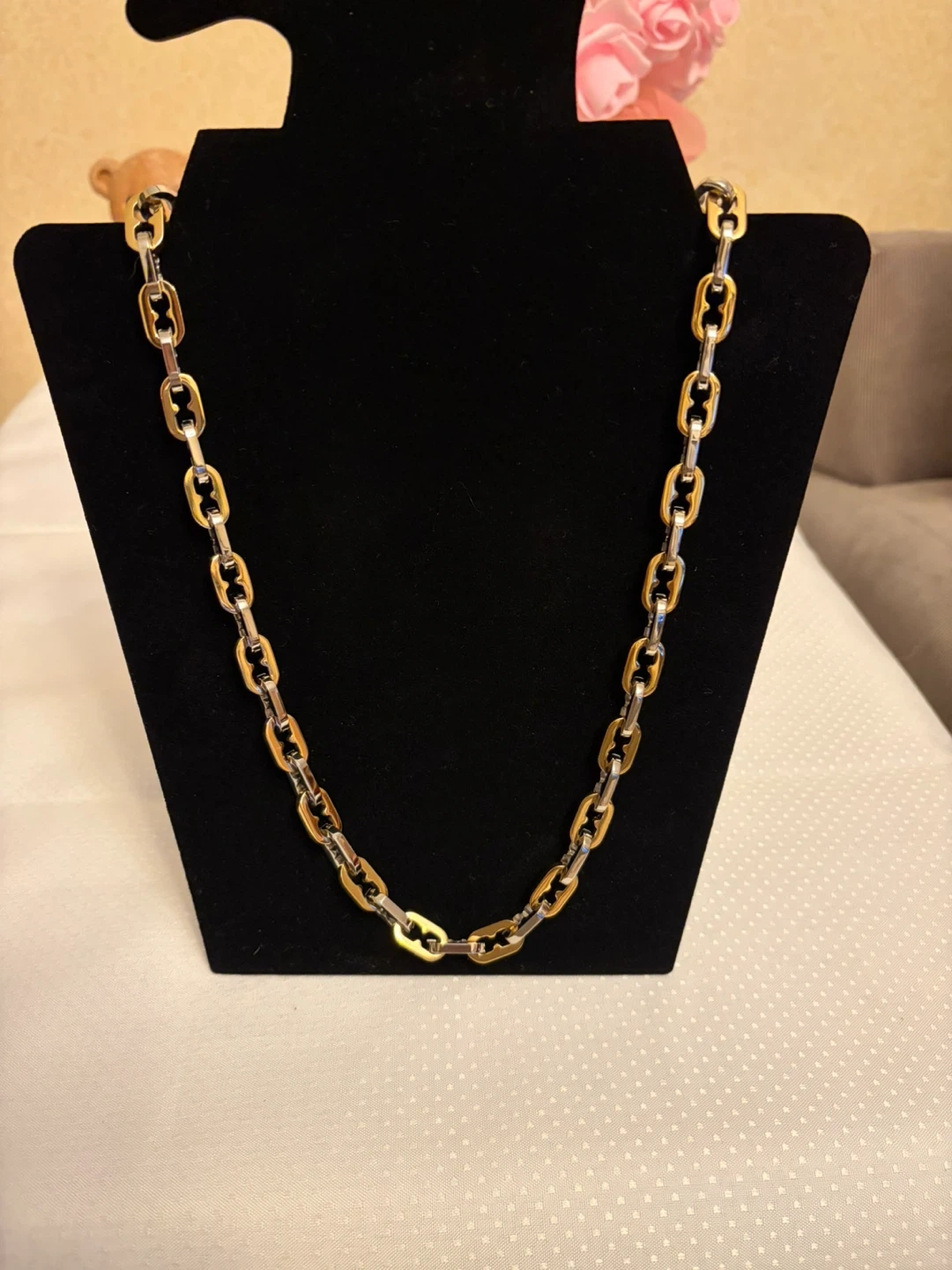 This stylish chain necklace features a two-tone design with alternating gold and silver-colored links. It's crafted from durable stainless steel Ion plated for long-lasting wear. The secure clasp makes it easy to put on and take off. It is 24 in long .