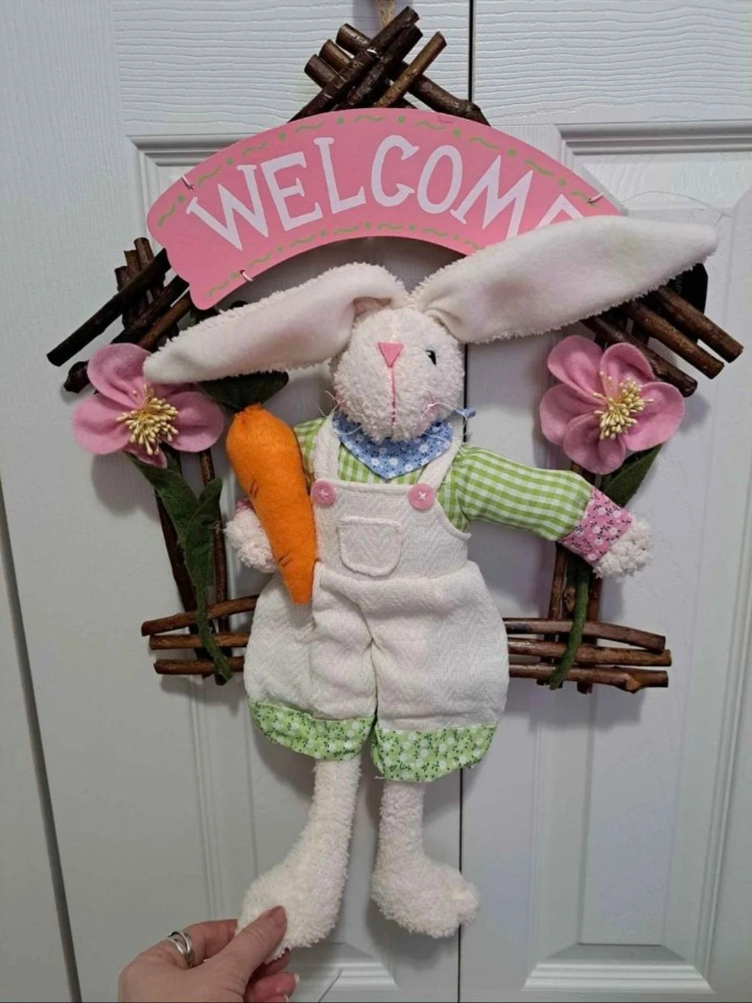 This adorable PAPRYUS Easter bunny welcome sign features a plush bunny holding a carrot. It's made with fabric and twig materials. Perfect for greeting guests during the spring season!