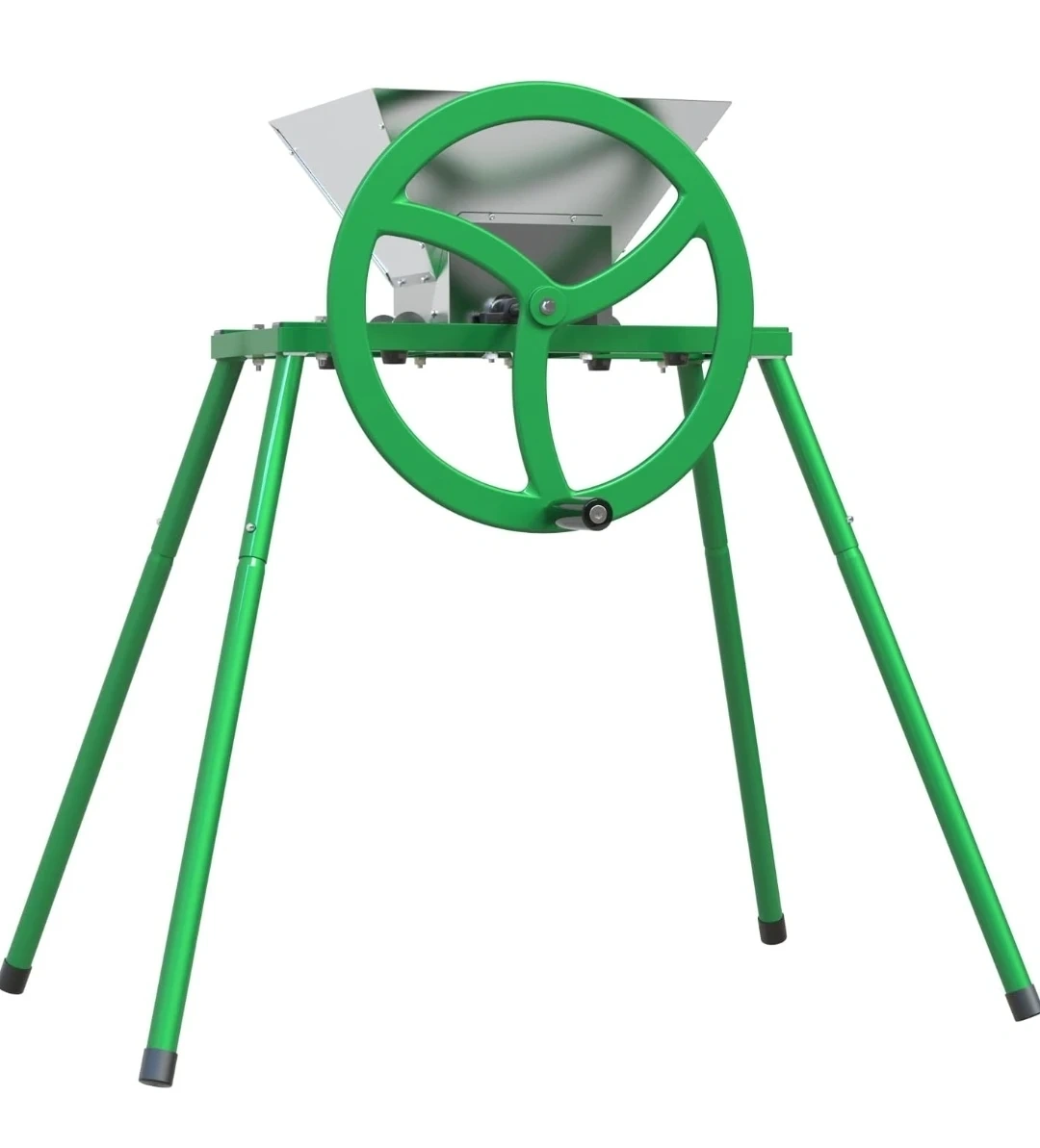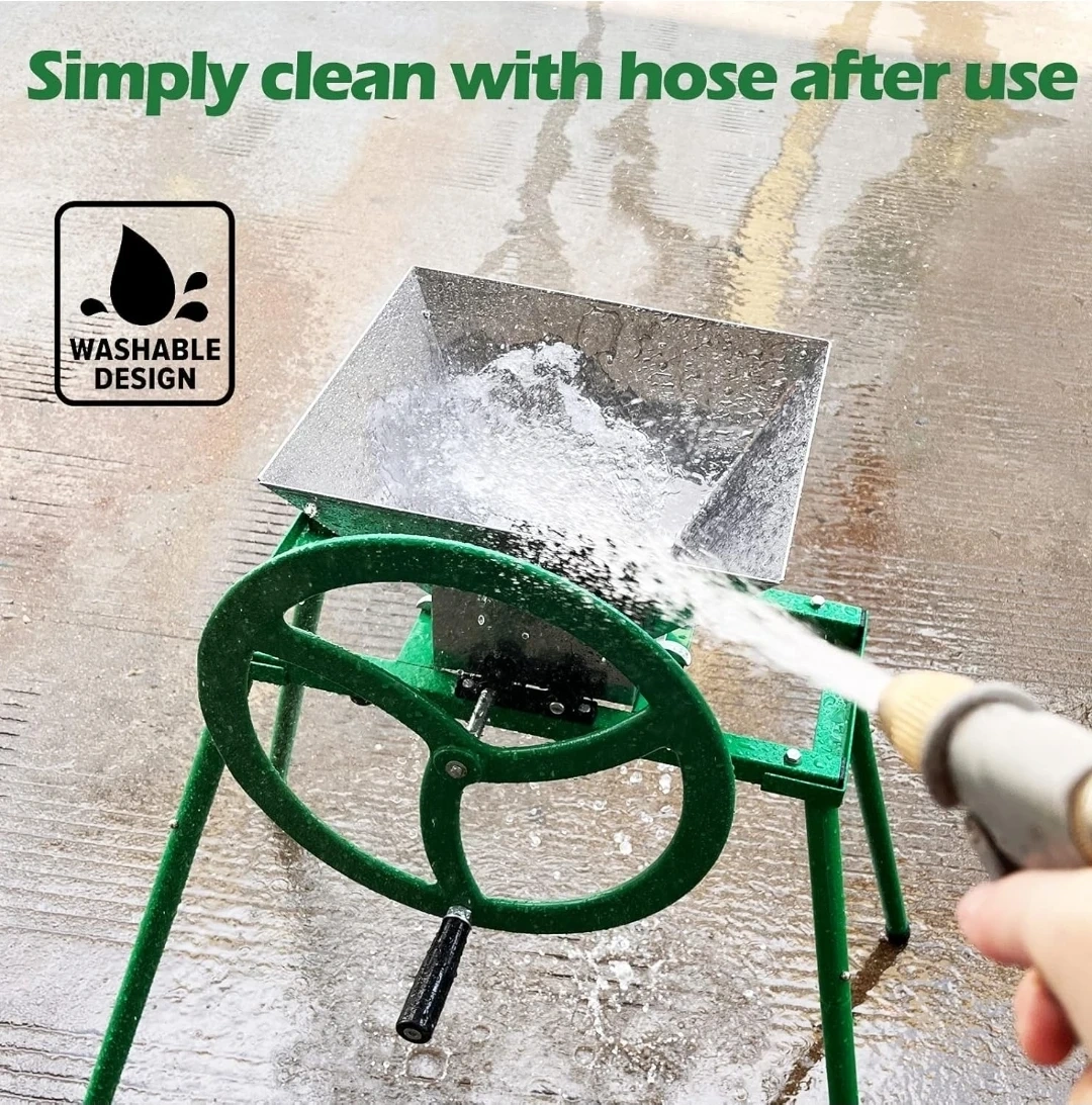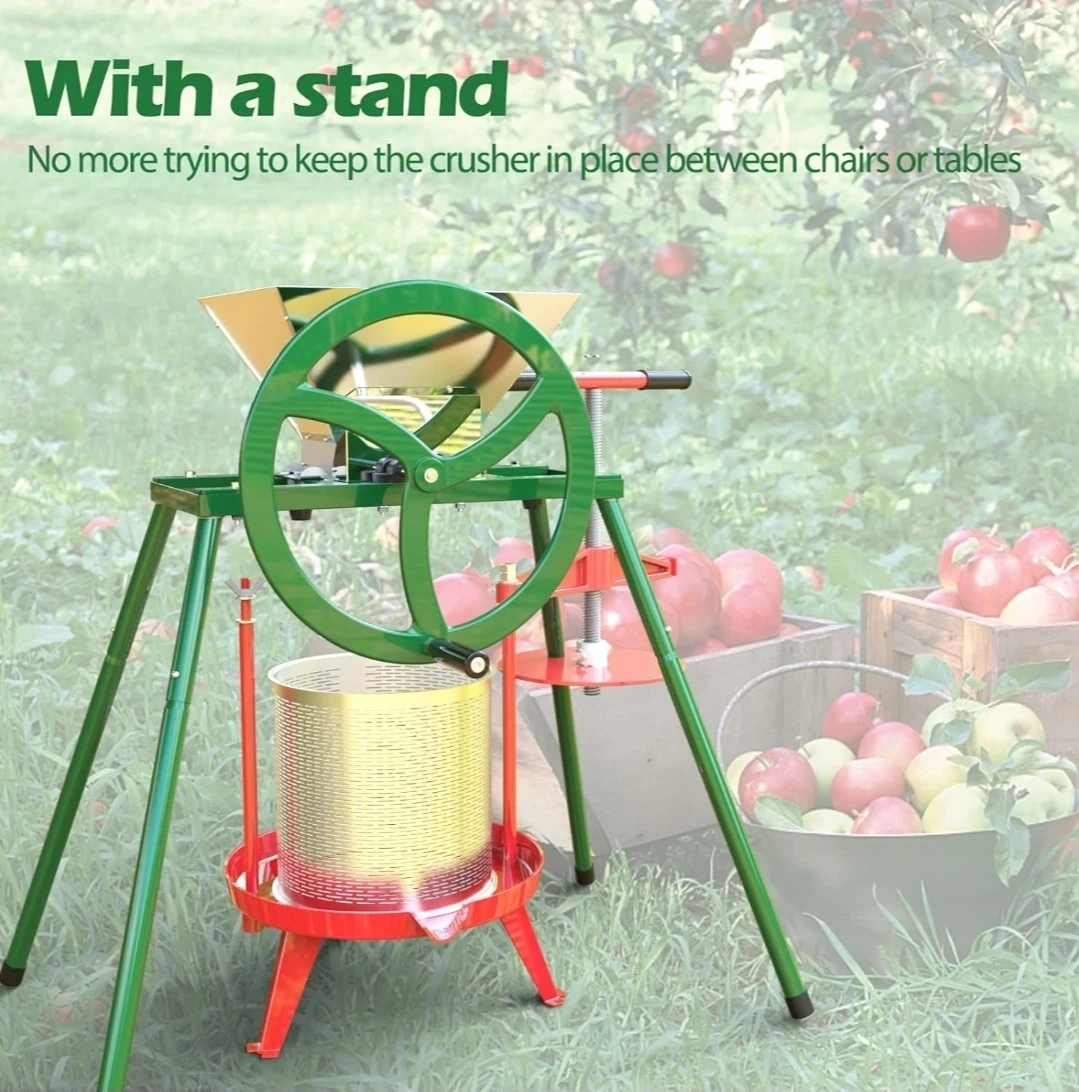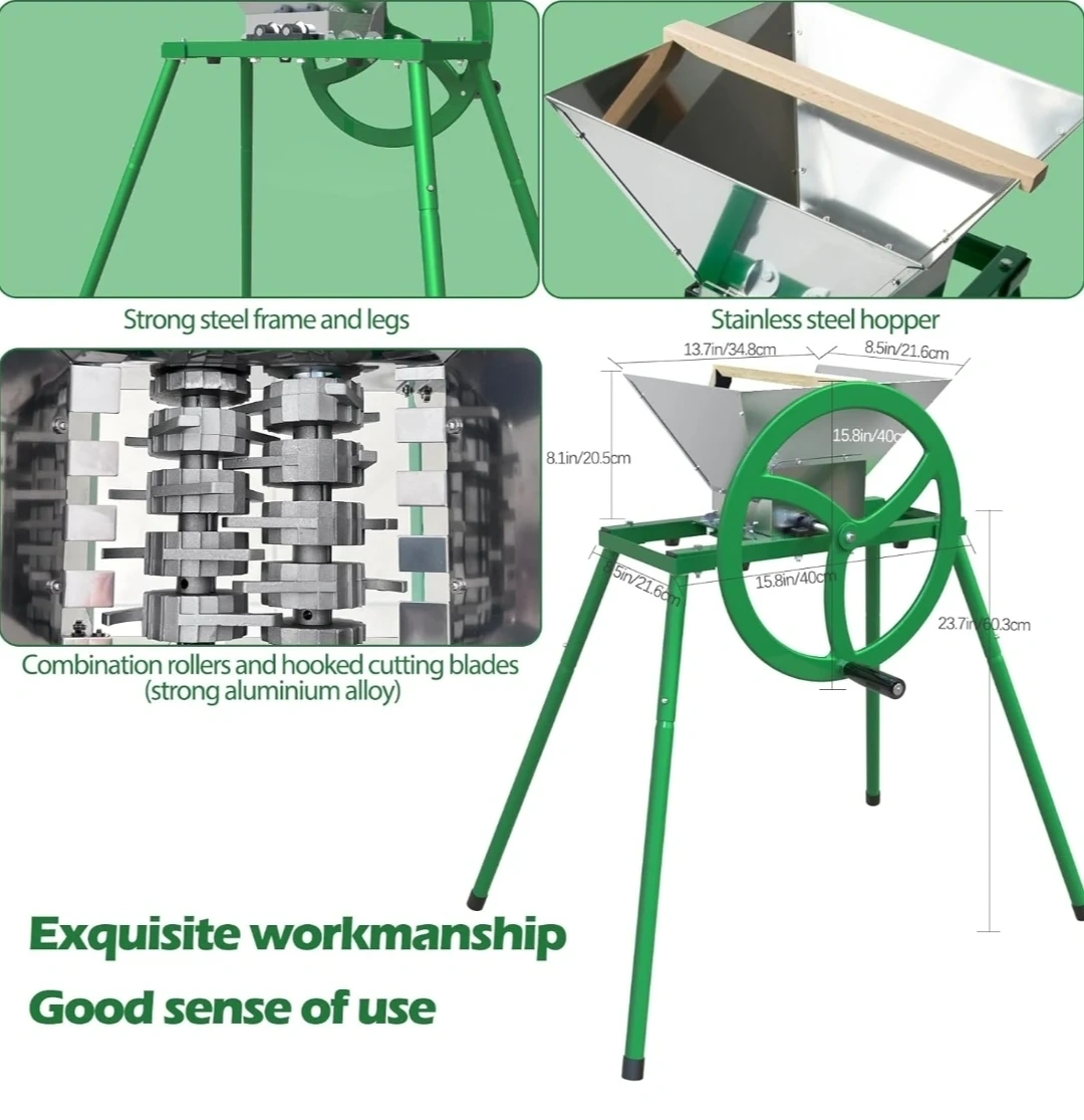 This manual fruit crusher features a stainless steel hopper and combination rollers with hooked cutting blades made of strong aluminium alloy. It has a strong steel frame and legs with a cast iron wheel handle for easy operation. It's great for pulping apples and other hard fruits for cider and juice making.